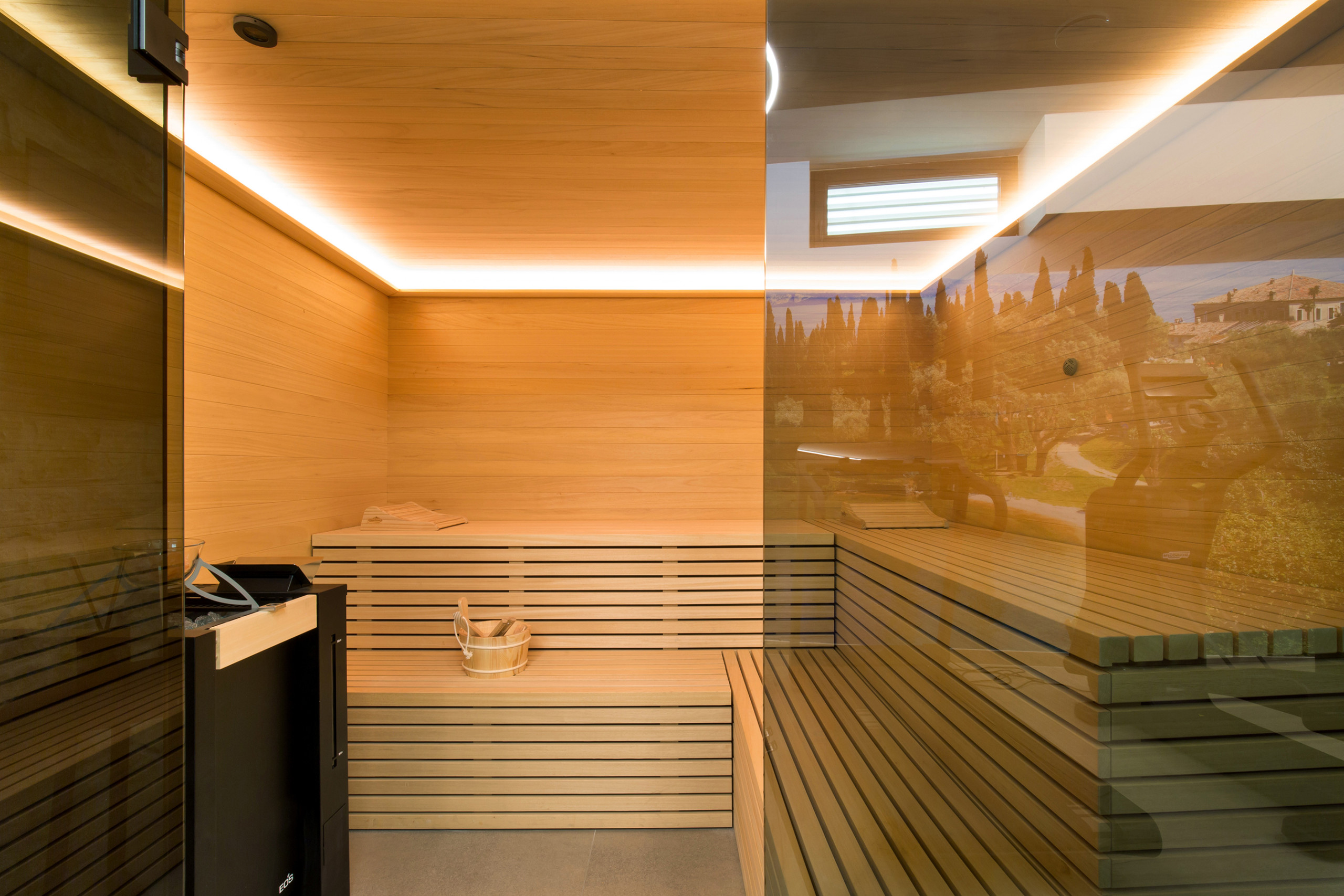 Die Gäste können den Wellnessbereich im Untergeschoss in der Nähe des Schwimmbads nutzen: