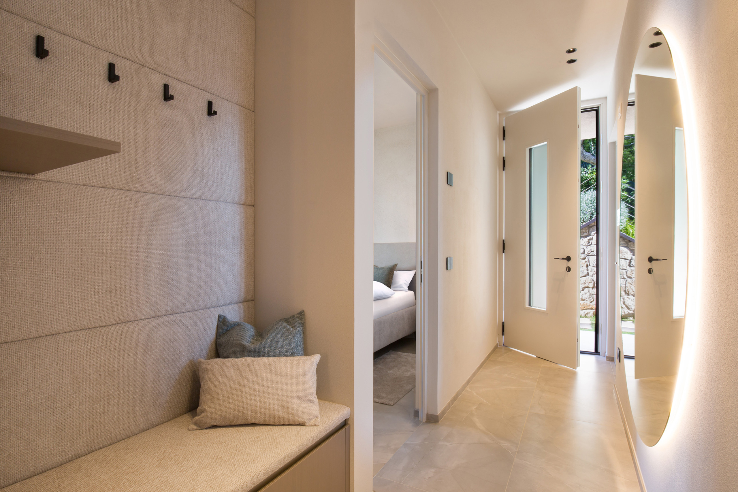 Der Eingang öffnet sich auf einen Flur, der zur Küche führt Auf dem Weg dorthin befinden sich zwei Schlafzimmer und ein modernes Badezimmer.