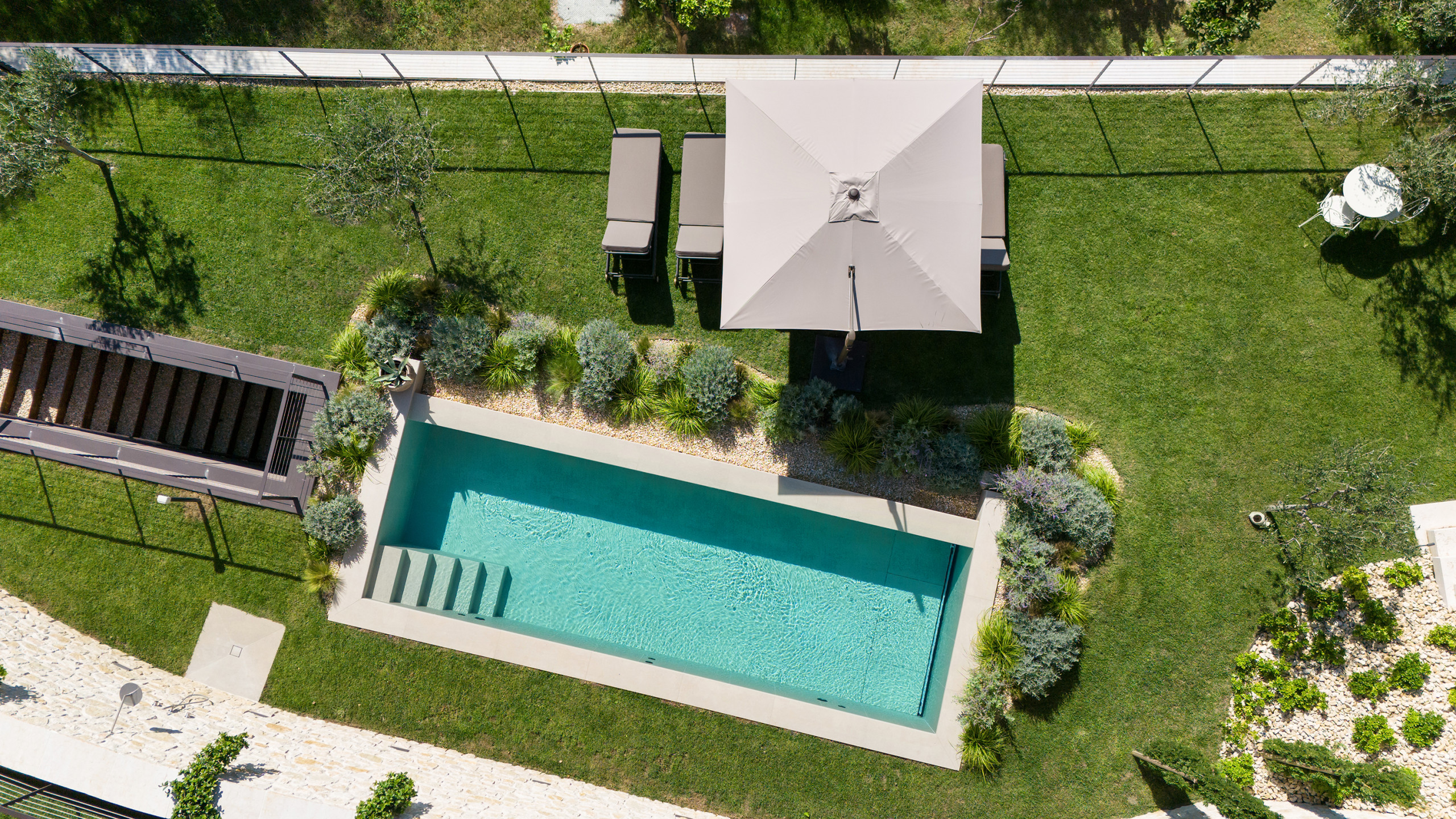 Gemeinsamer Pool mit Sonnenliegen für die Gäste, perfekt um die Sonne in Ruhe in einem grünen und privaten Umfeld zu genießen.