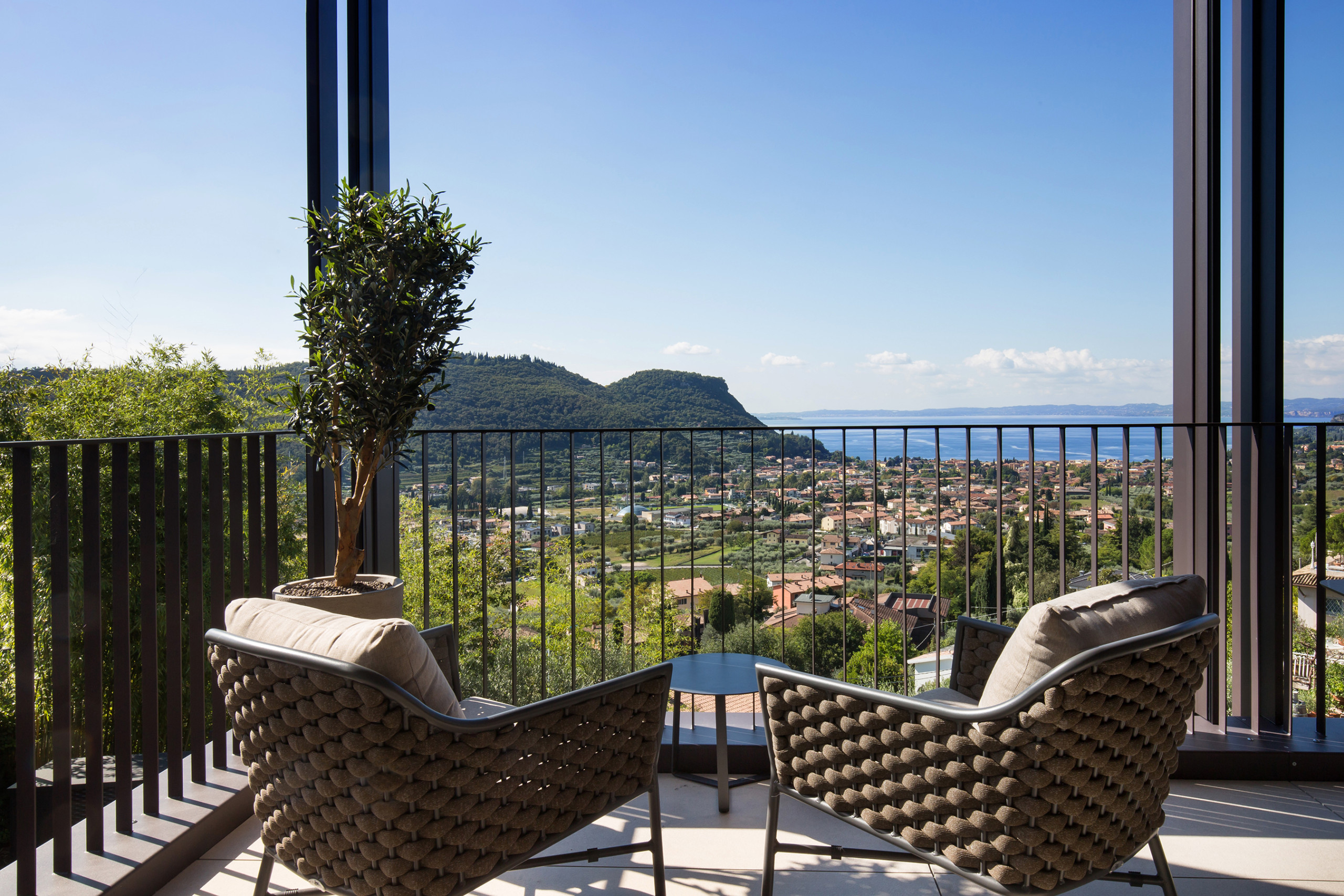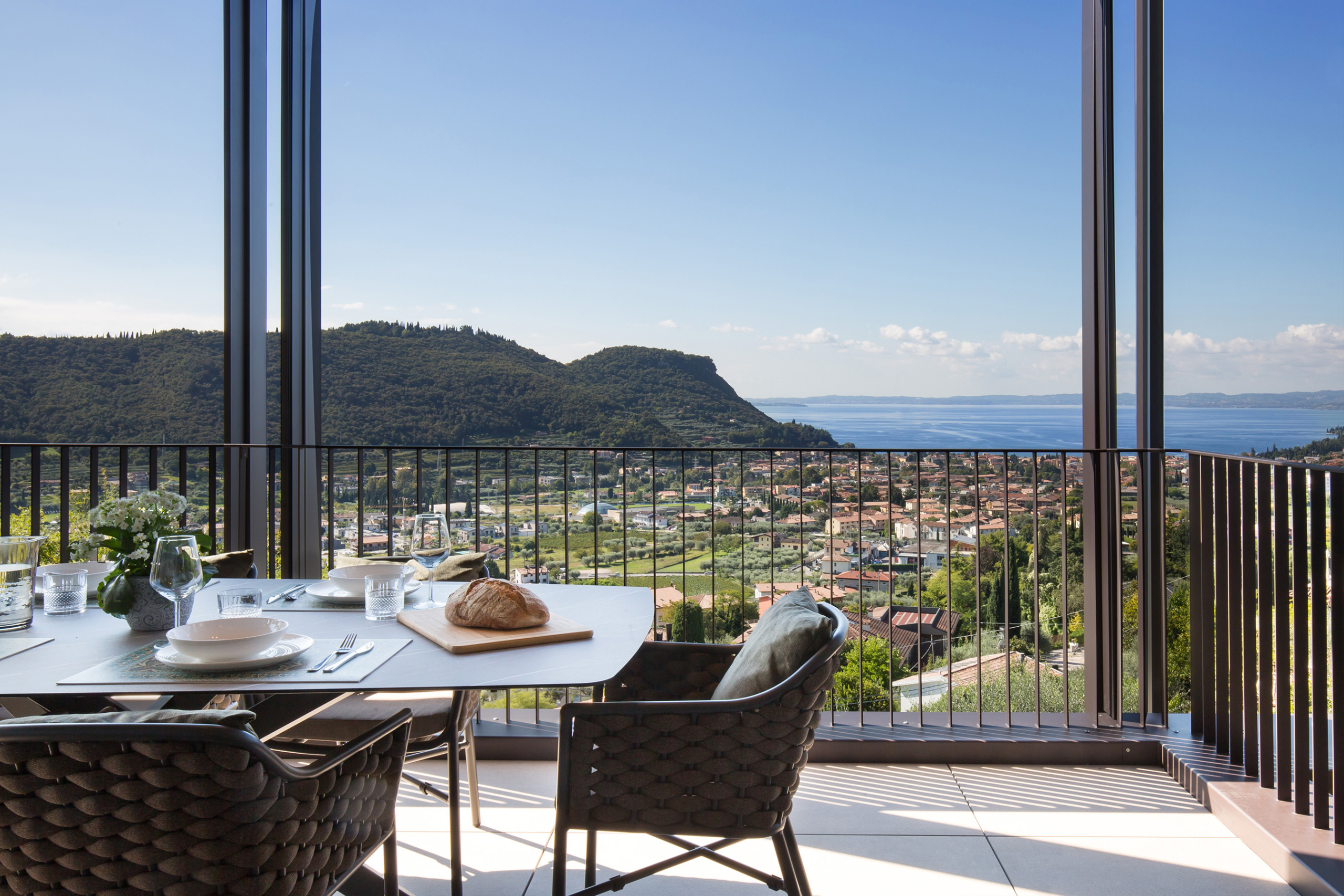 Vom Wohnzimmer und Schlafzimmer aus haben Sie direkten Zugang zur großen und sonnigen Terrasse, die mit einem Esstisch und Sonnenliegen ausgestattet ist und von der aus Sie einen atemberaubenden Blick auf den See und die umliegenden Hügel genießen können.