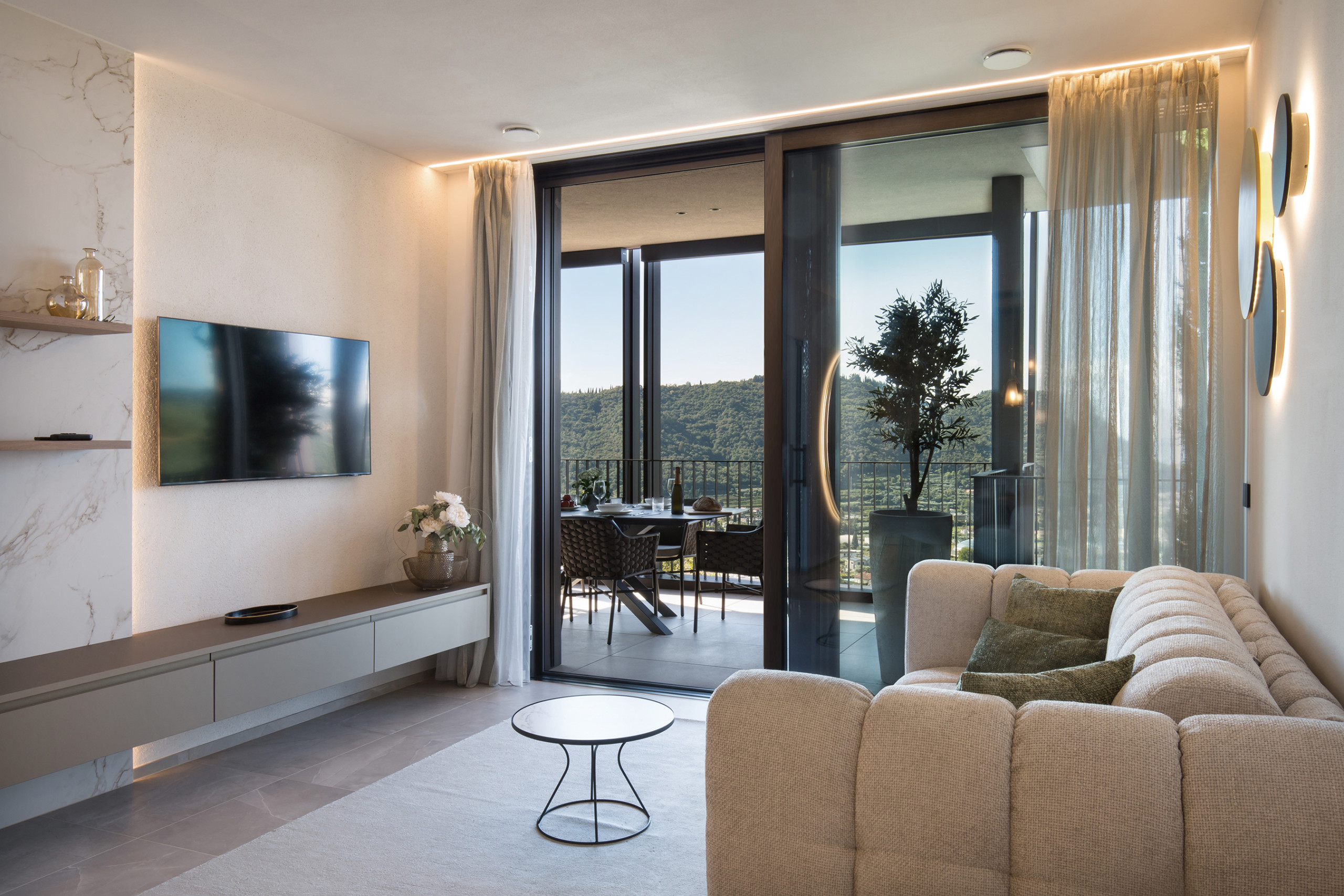 Das Wohnzimmer ist elegant eingerichtet und verfügt über einen Esstisch für vier Personen, ein Sofa und einen Satelliten-Fernseher. Im Freien befindet sich auf der Seeblick-Terrasse auch ein Tisch mit 4 Sesseln für Mahlzeiten im Freien.