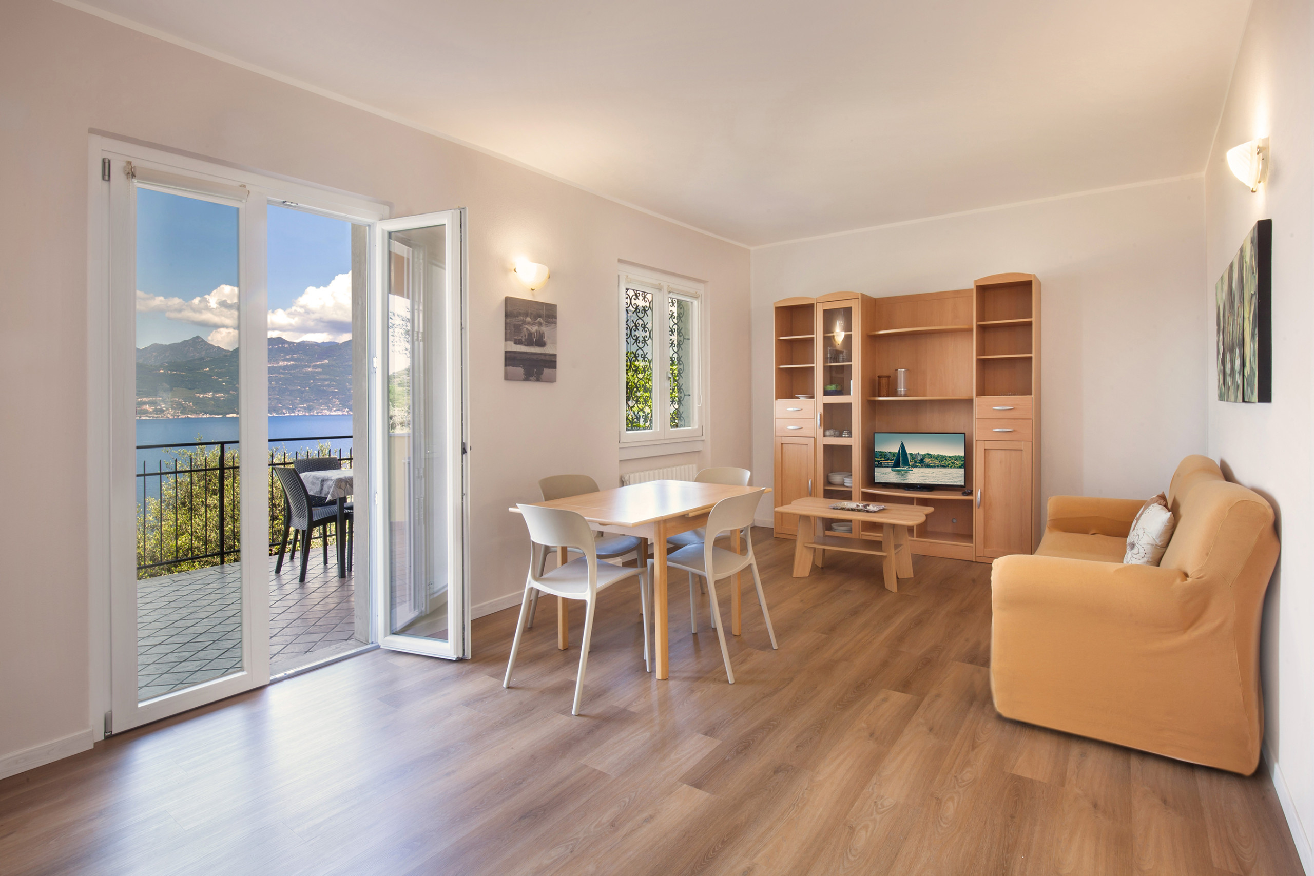 Apartment Erika besteht aus einem hellen Wohnzimmer mit Sat-TV, das mit einer großen Terrasse verbunden ist, die perfekt für Mahlzeiten im Freien oder zum Entspannen bei Bewunderung des herrlichen Seeblicks ist. Die Küche, obwohl klein, ist gut ausgestattet mit Kühlschrank, Gasherd und allen notwendigen Annehmlichkeiten.