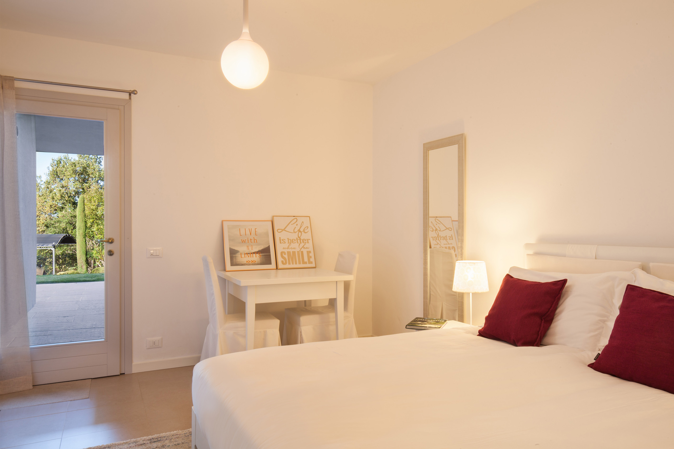 Das dritte Doppelzimmer, das mit dem zweiten verbunden ist, hat direkten Zugang zur Terrasse und verfügt über ein privates Badezimmer mit Dusche, das über die Terrassentür zugänglich ist.