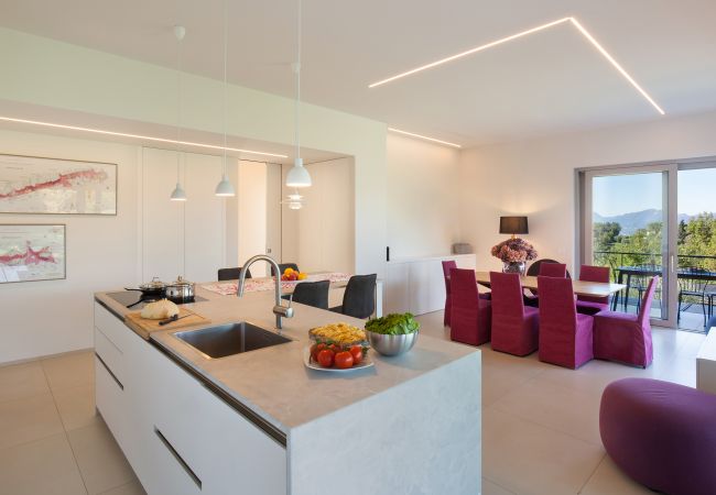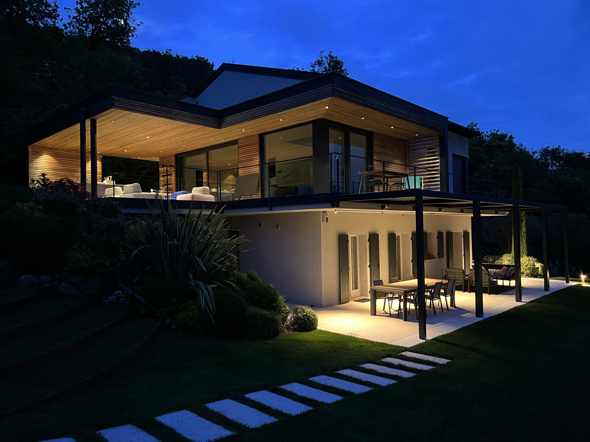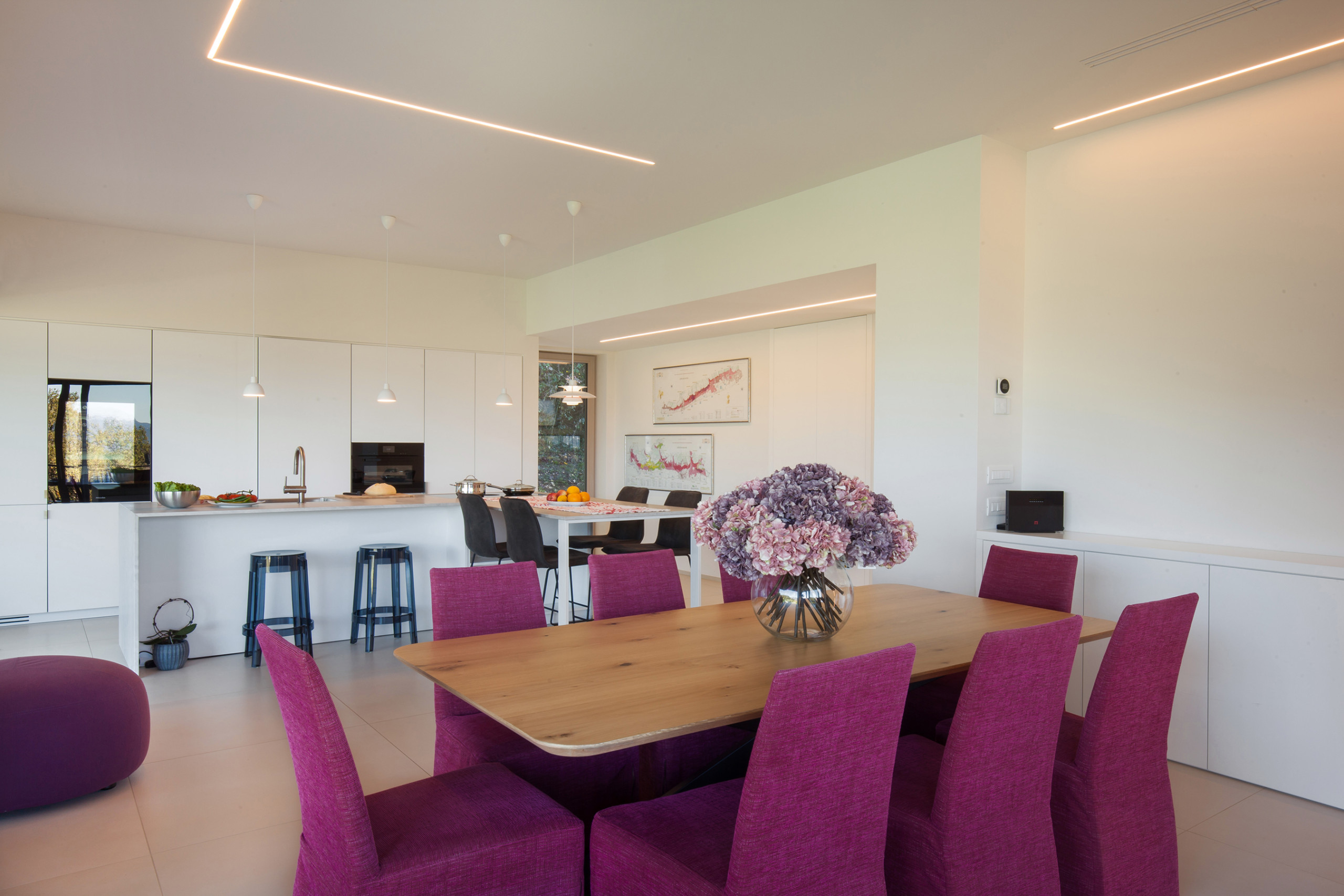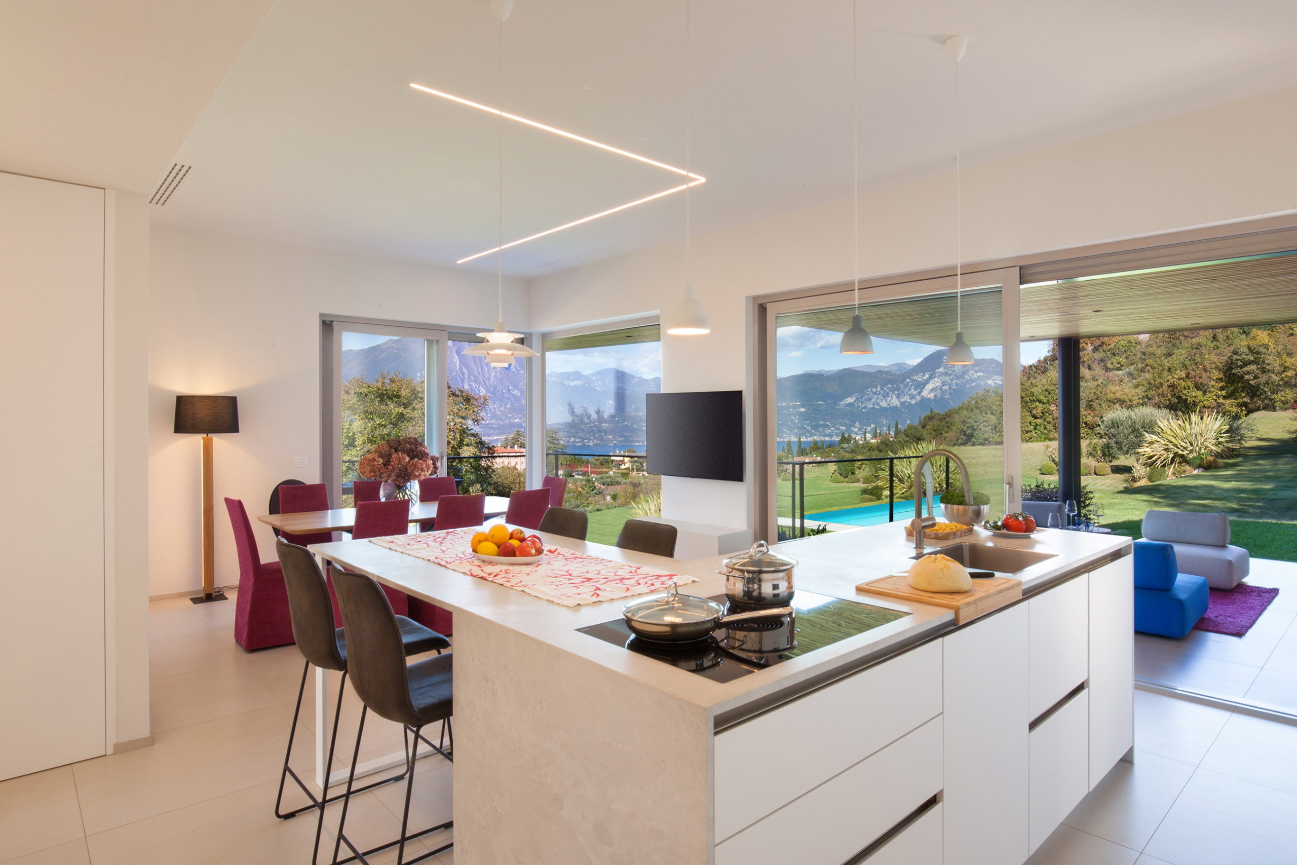 Das mit modernem Design eingerichtete Haus empfängt Sie in seiner Küche und im Essbereich mit einer Ganzglaswand mit Blick auf den See und die Berge.
