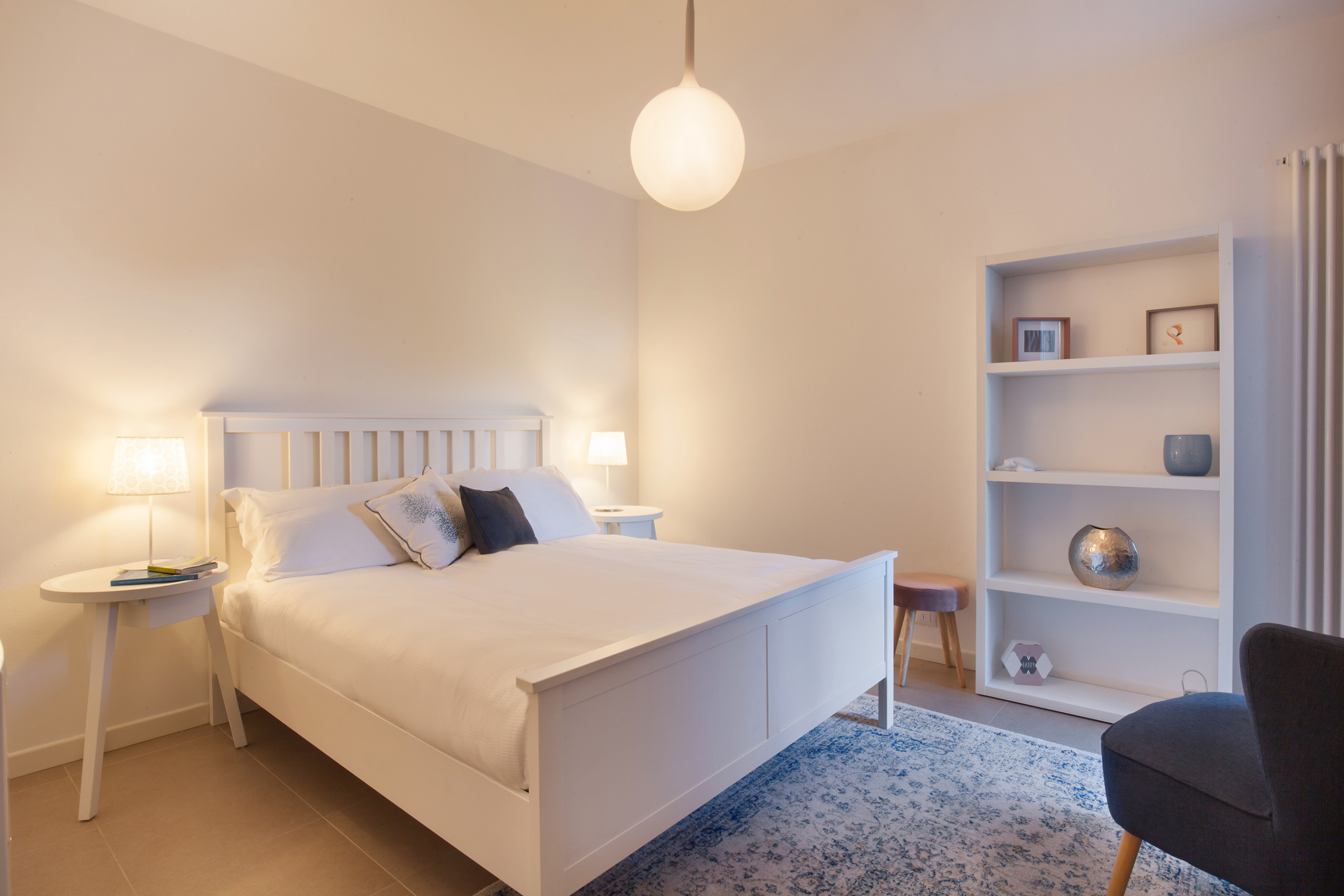 Der Schlafbereich beherbergt ein Doppelzimmer mit Blick auf das Grün des Gartens und ein zweites Doppelzimmer mit großem Kleiderschrank. Die beiden Zimmer teilen sich ein geräumiges Badezimmer mit Walk-In-Dusche.