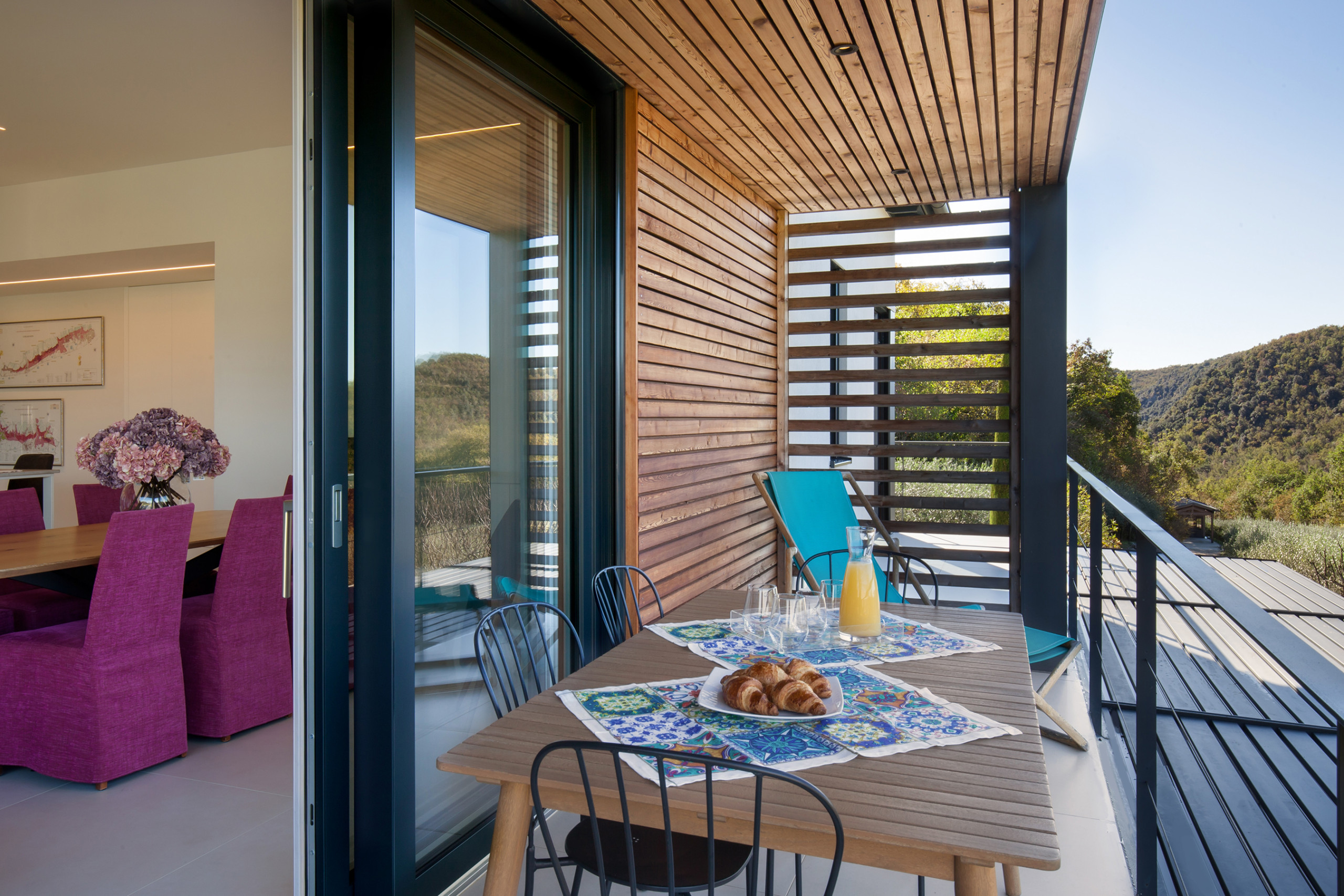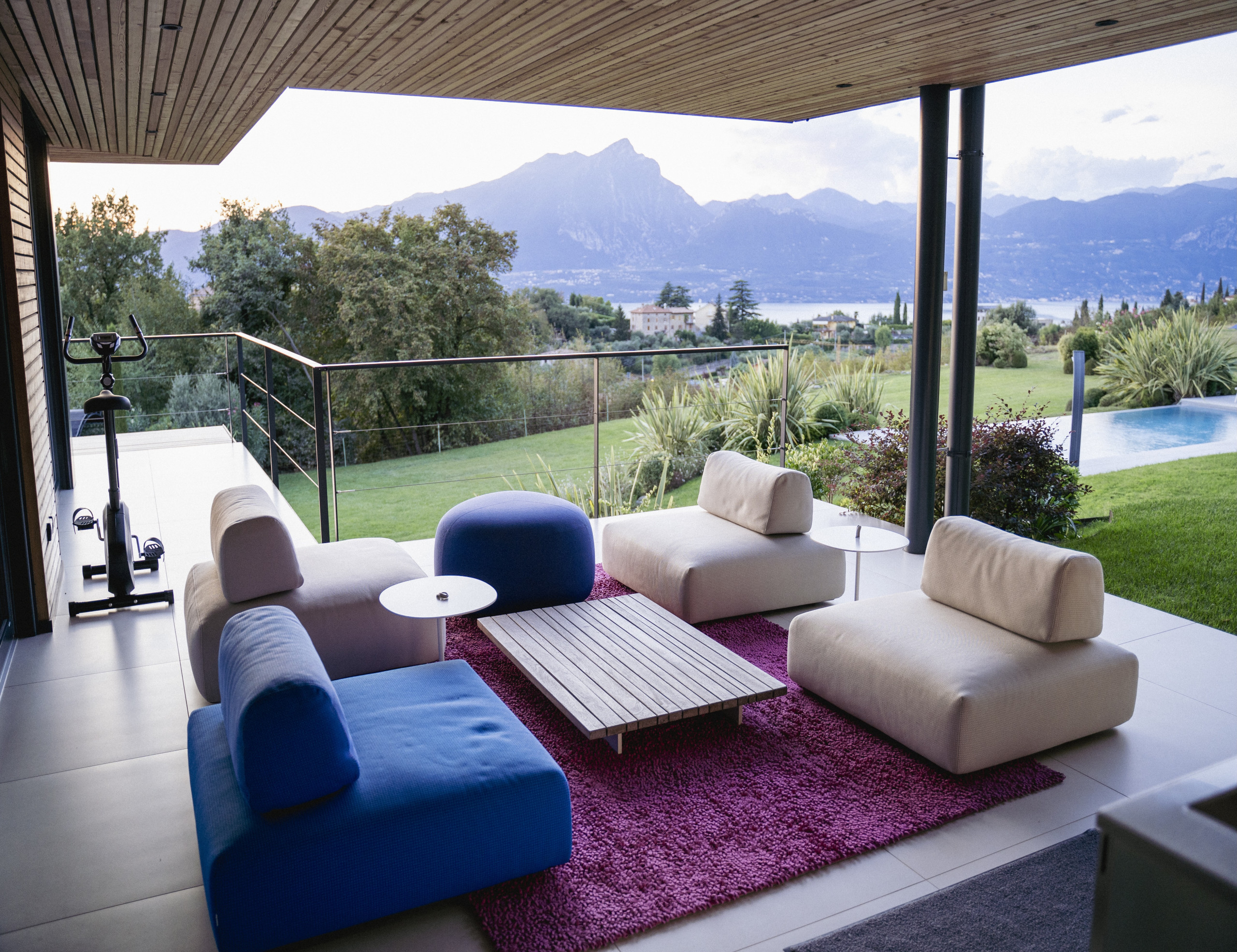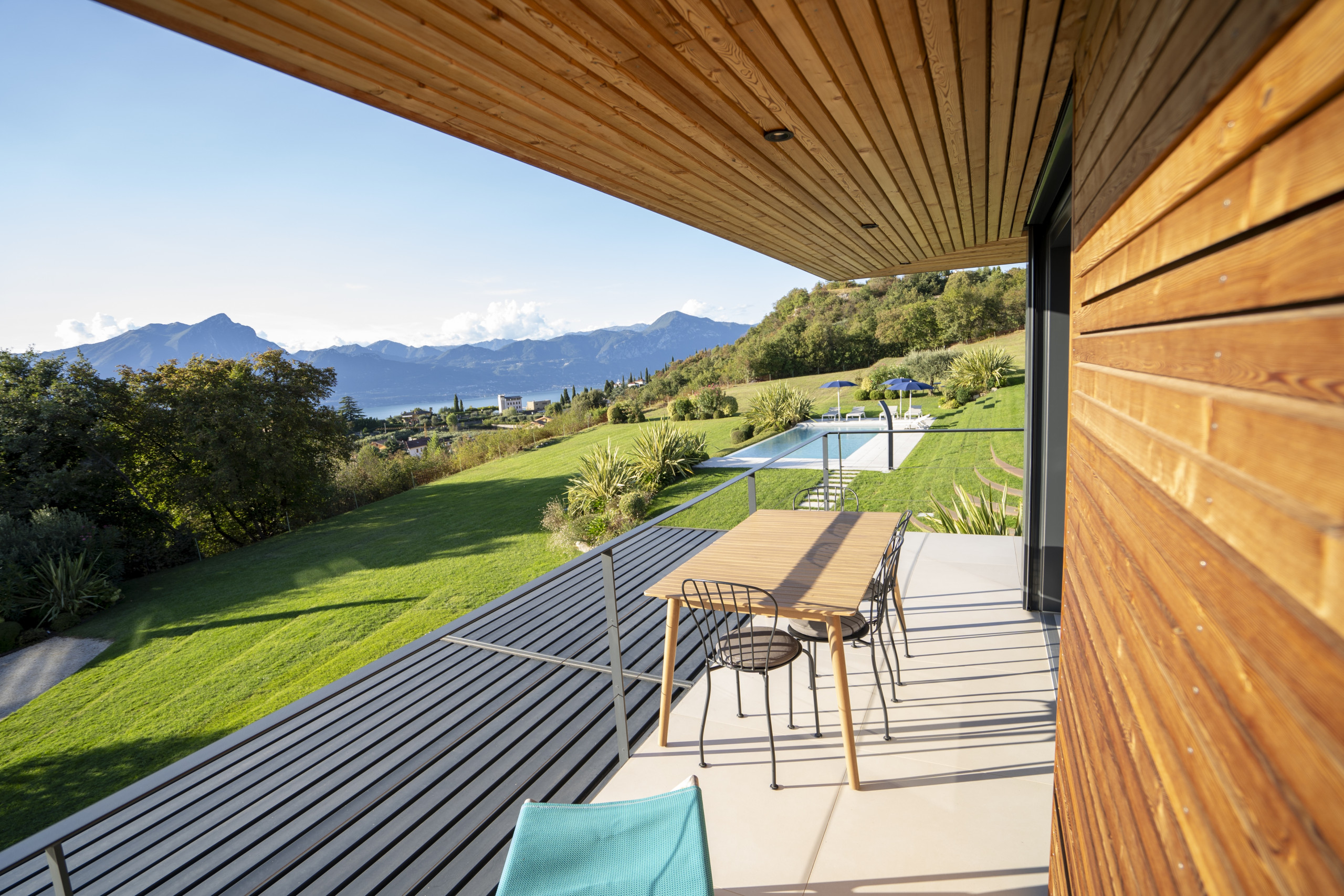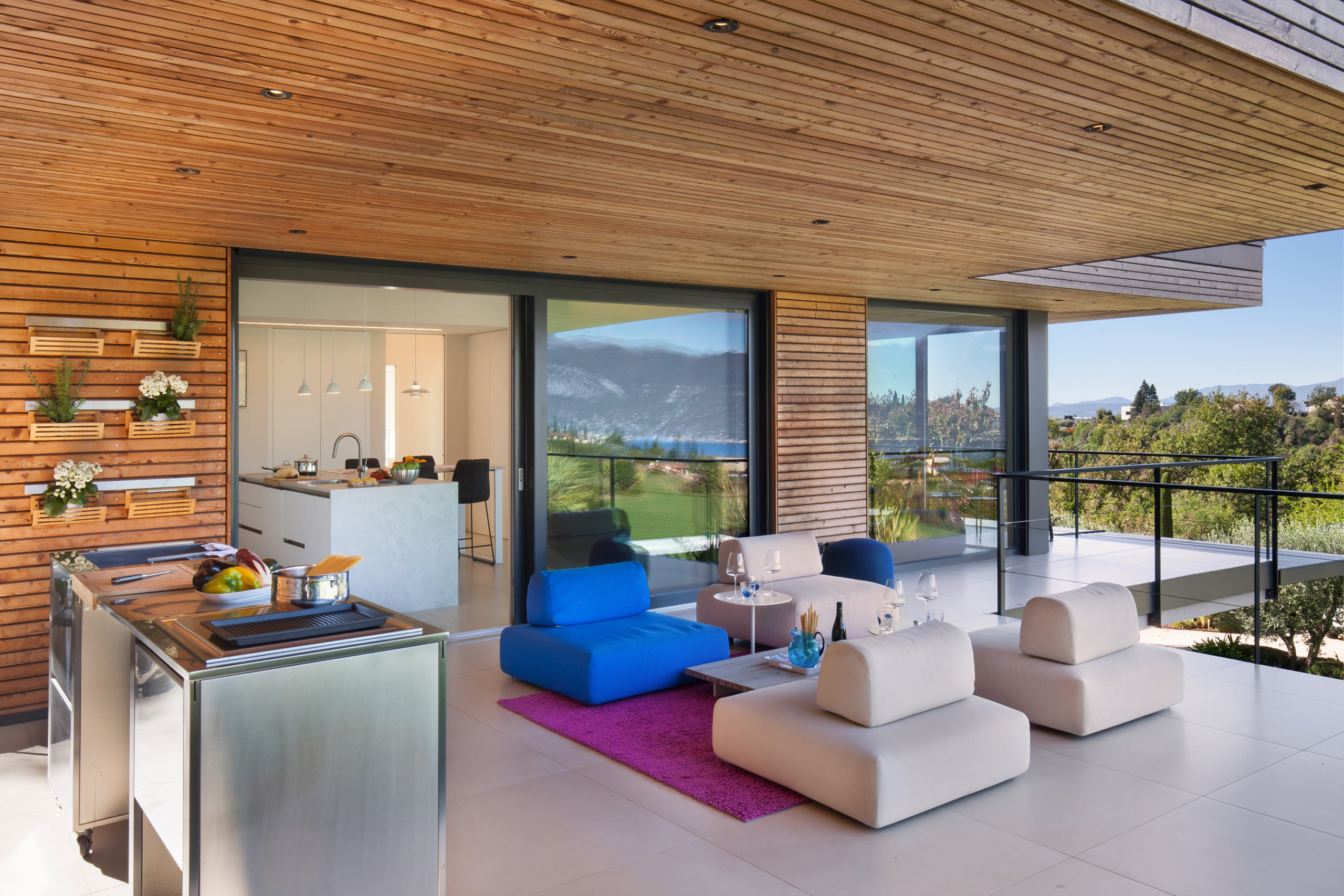 Im Außenbereich verfügen die Gäste über eine überdachte Terrasse mit Loungebereich, ideal für einen Aperitif bei Sonnenuntergang mit Seeblick.