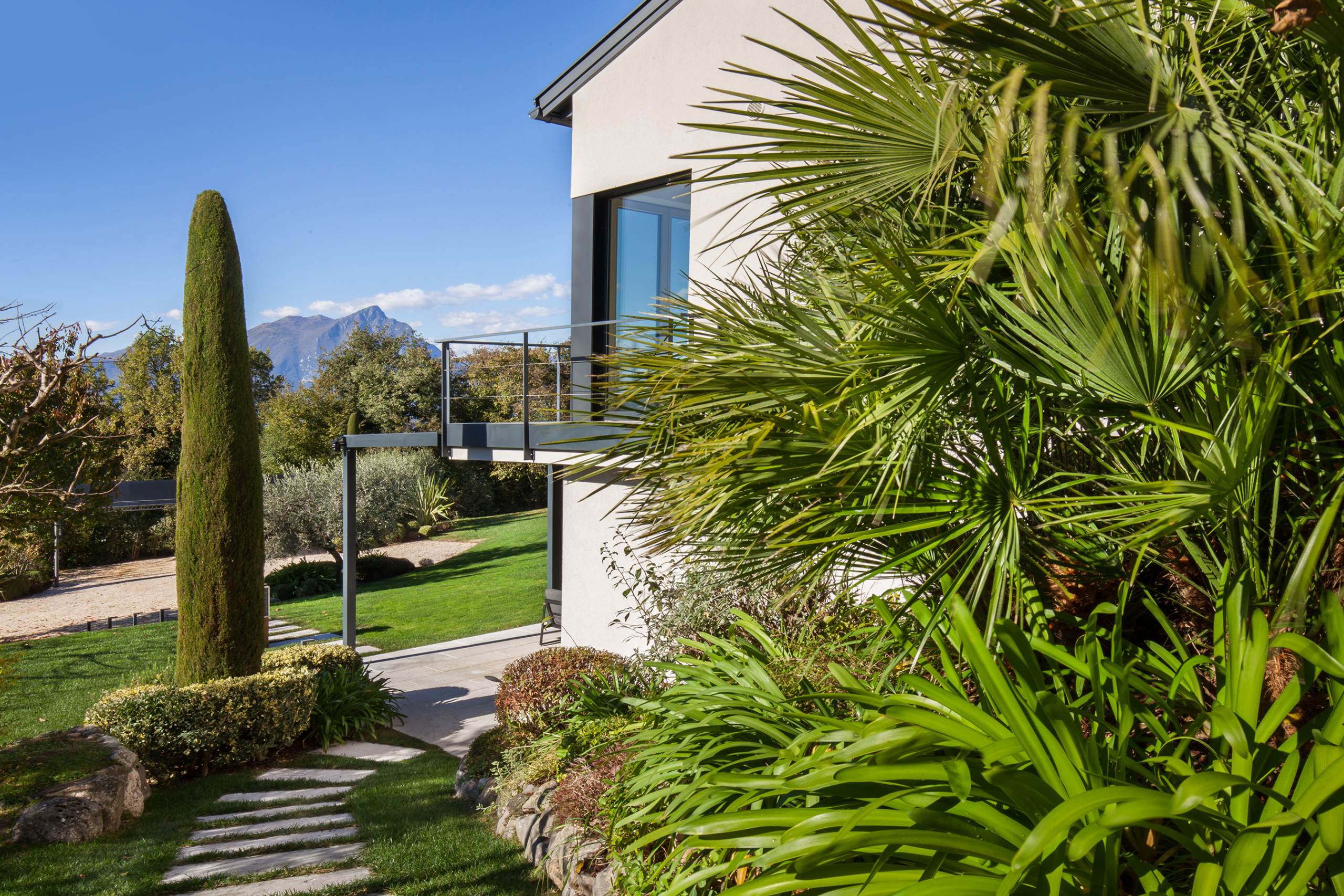 Auf der Terrasse mit Seeblick befinden sich der Esstisch, der Grill und der kleine Pool mit Seeblick und einer Sonnenliegen-Zone. Das Grundstück verfügt über einen Garten mit Terrassen zum Entspannen und Sonnenbaden.