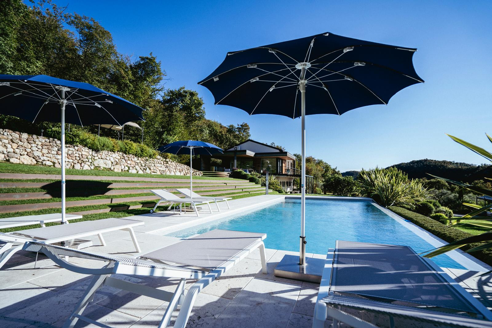 Der private Swimmingpool, geräumig und sonnig, ist von einem Bereich mit Sonnenliegen und Sonnenschirmen umgeben.