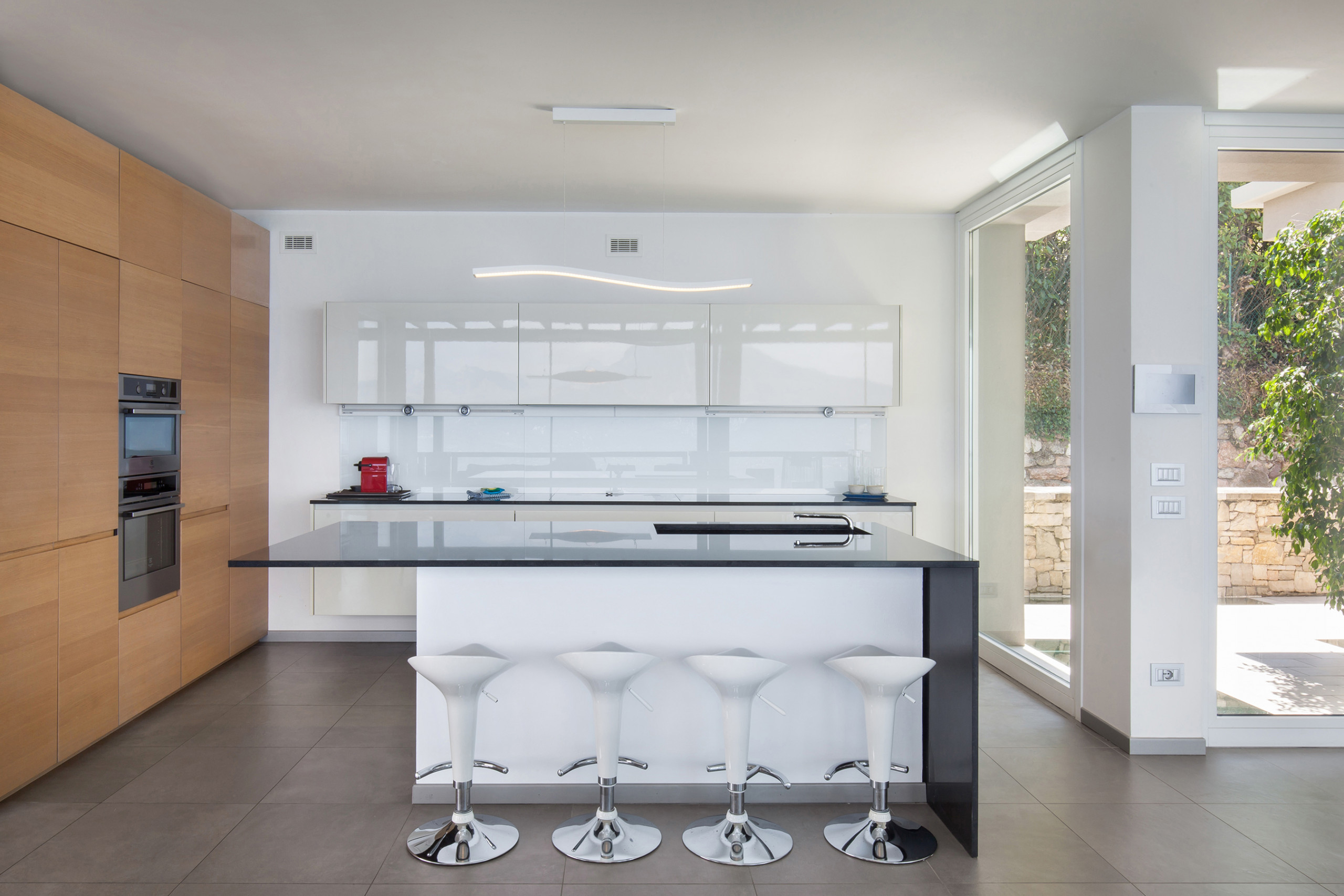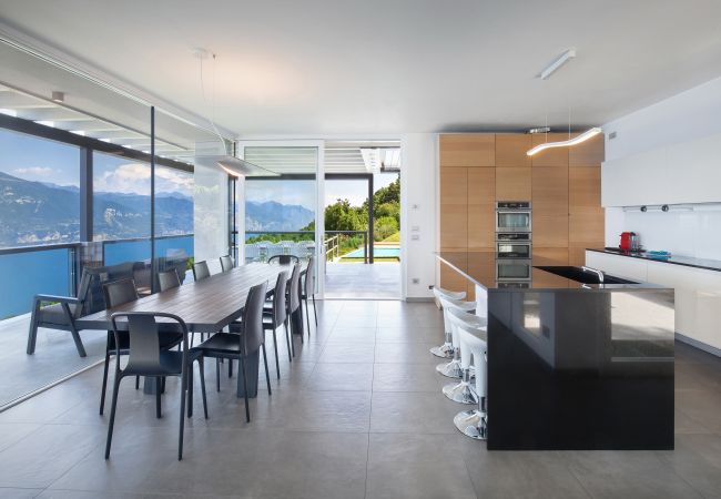 Das mit modernem Design eingerichtete Haus empfängt Sie in seiner Küche und im Essbereich mit einer Ganzglaswand mit Blick auf den See und die Berge.
