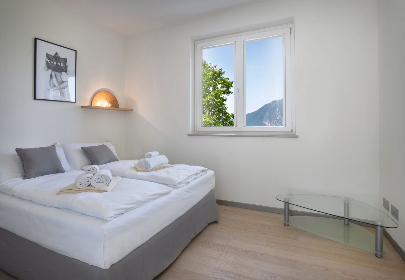 Der Schlafbereich umfasst ein Doppelzimmer mit Terrassentür, einen geräumigen Kleiderschrank und ein zweites Doppelzimmer.