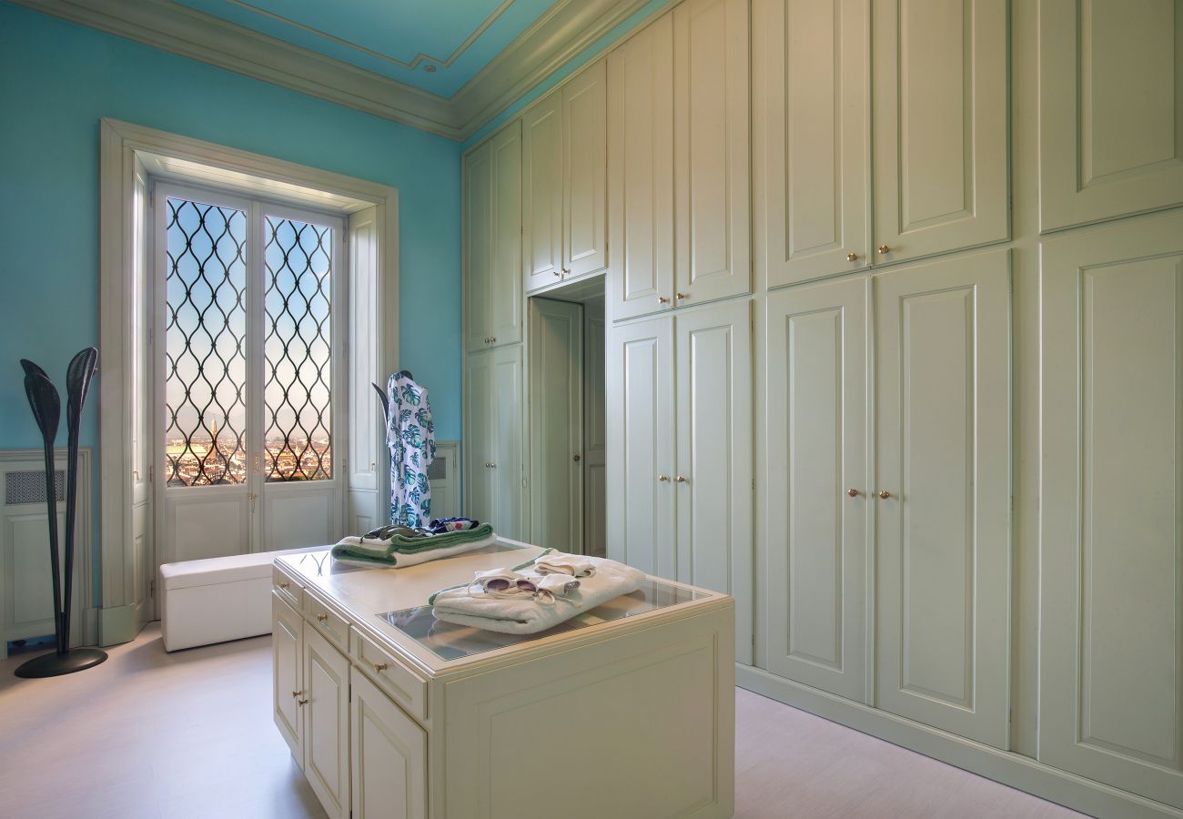 Wir betreten dann das Wohnzimmer, das zum Hauptschlafzimmer mit Kleiderschrank und eigenem Bad mit Dusche und Whirlpool führt. Der Balkon und die großen Fenster des Hauptschlafzimmers blicken auf den Park und bieten einen weiten Blick auf die Stadt Vicenza.
