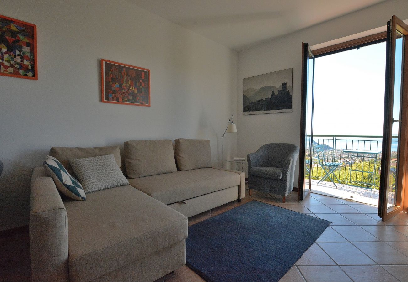 Dal soggiorno e dalla camera da letto si accede direttamente a un ampio e soleggiato balcone attrezzato con un tavolo per pranzare e lettini prendisole e dal quale si può godere di una vista mozzafiato sul lago e sulle colline circostanti. Pertinente all'appartamento c'è anche un giardino privato con un grande barbecue e ulteriori lettini prendisole