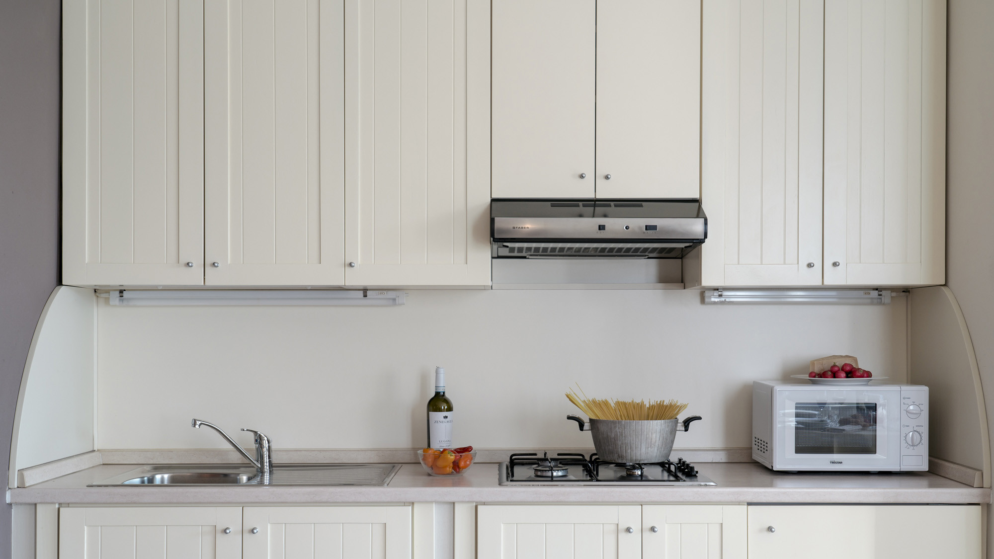 La cucina americana, a gas, è attrezzata con frigorifero, microonde, congelatore, lavastoviglie, stoviglie/posate, caffettiera, tostapane, bollitore e spremi agrumi.