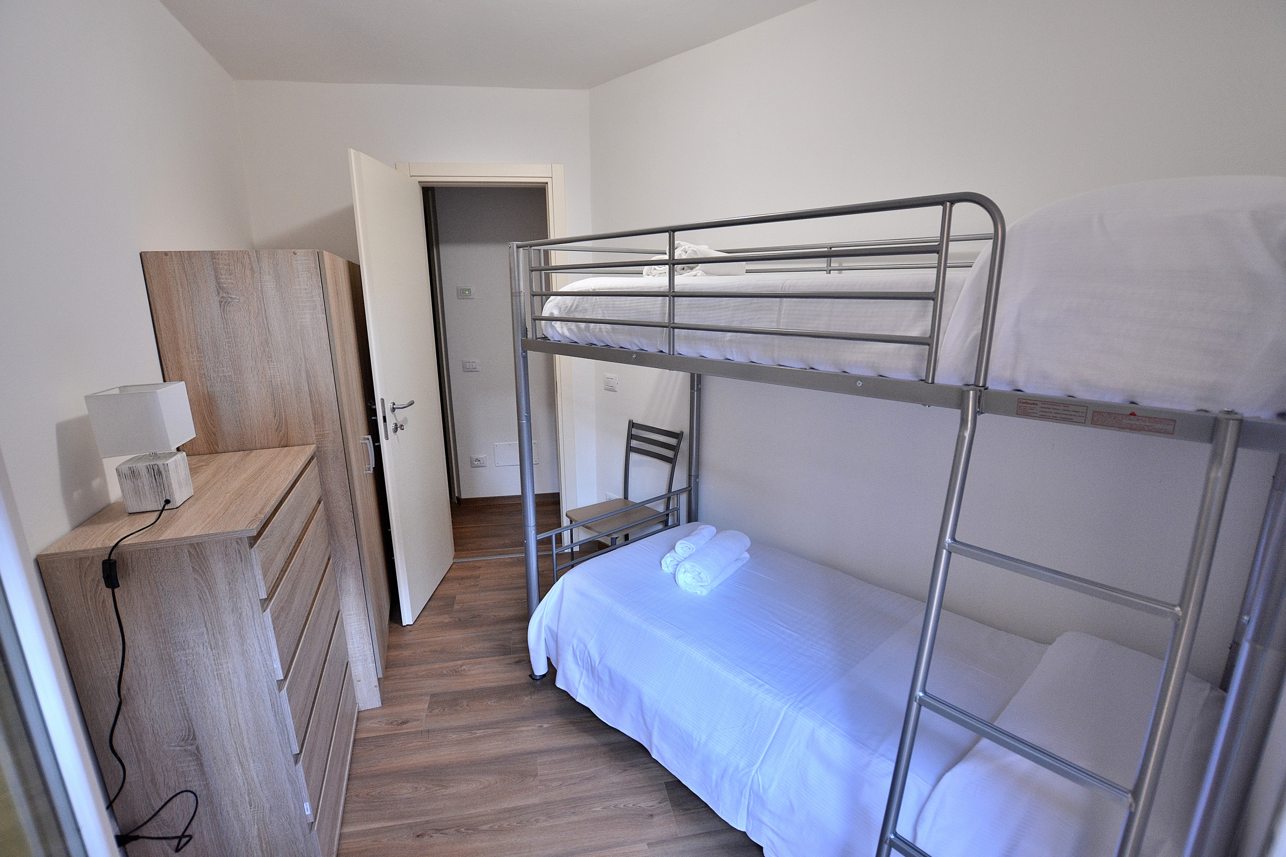L'appartamento, dotato di aria condizionata, offre al secondo piano una camera matrimoniale, una camera con un letto a castello ed un bagno completo con doccia. Al terzo piano un'altra camera da letto matrimoniale ed un bagno completo di doccia.