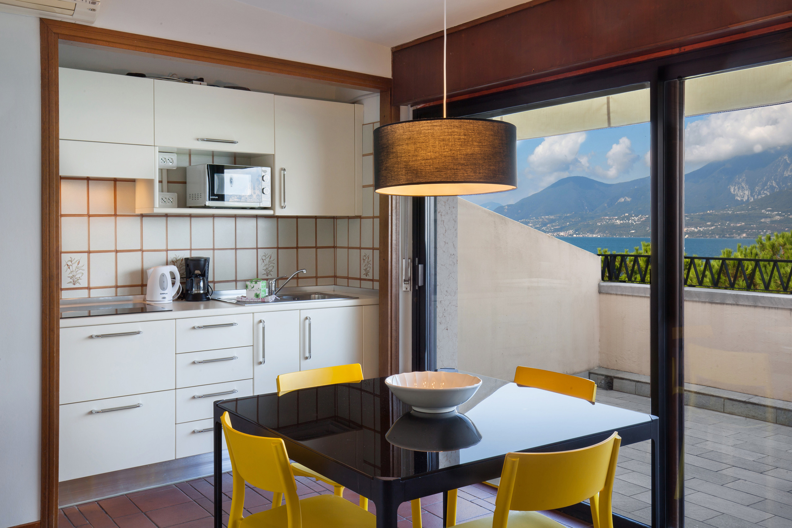 L'appartamento è composto da un luminoso soggiorno con angolo cottura collegato a una seconda soleggiata terrazza affacciata sul lago.