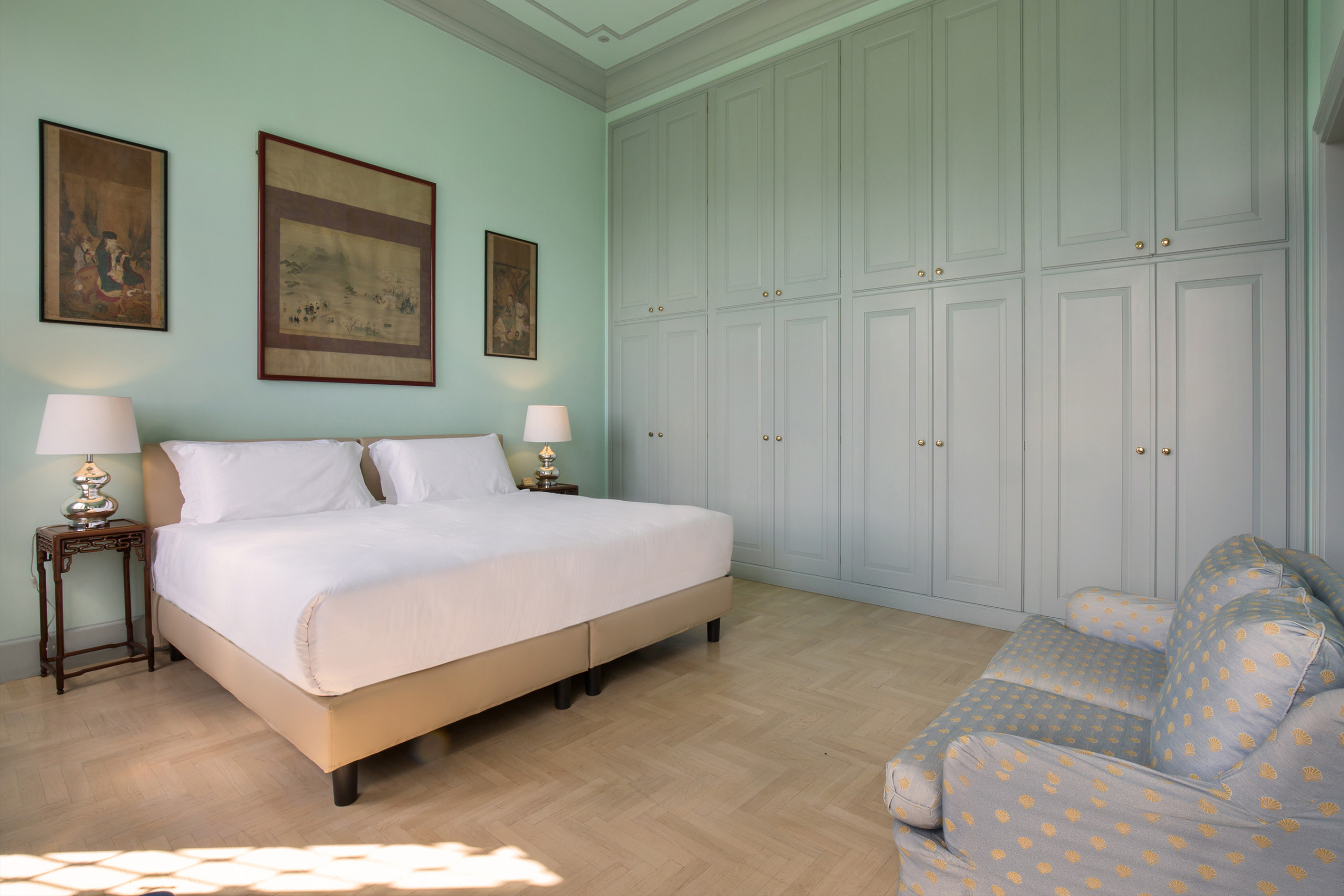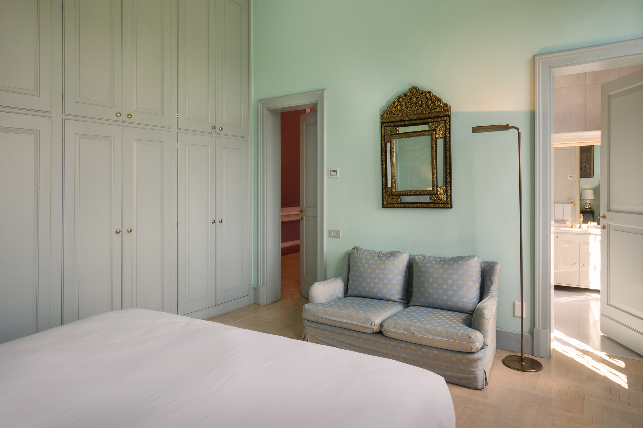 Entriamo poi nel salottino che conduce alla Masterbedroom con stanza armadi e bagno ensuite con doccia e vasca idromassaggio. Il balcone e le grandi finestre della Masterbedroom affacciano sul parco e offrono un’ampia vista della città di Vicenza.