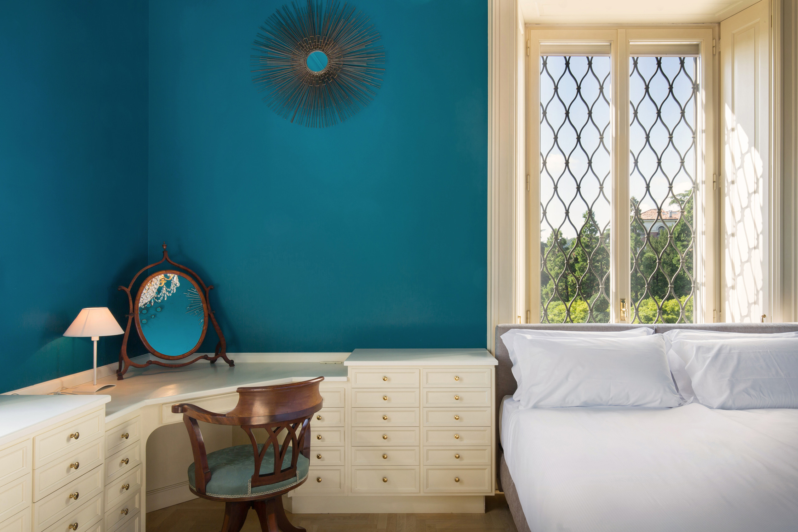 Le camere sono ampie e luminosissime, e ogni stanza è dotata di ampie finestre che permettono di godere della vista sul verde circostante o sulla città di Vicenza.