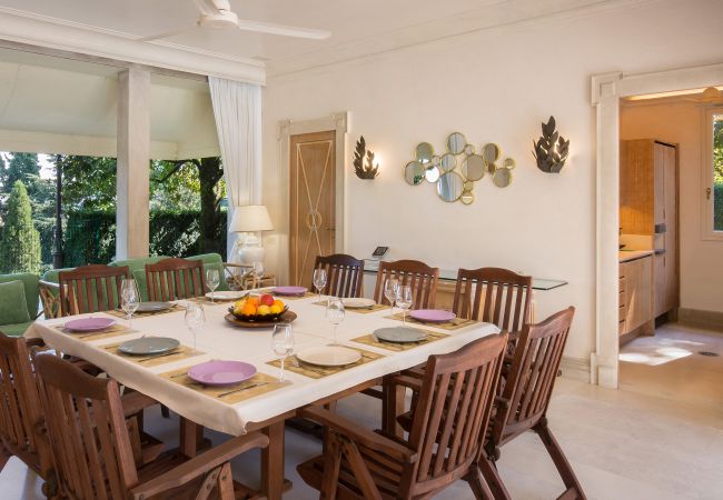 La cucina, ampia e moderna, è completamente attrezzata con elettrodomestici di alta gamma e dispone di un'isola centrale, ideale per la preparazione dei pasti per un gruppo numeroso. Comunicante con la cucina abbiamo una stanza dedicata alla zona colazione, comoda e funzionale.