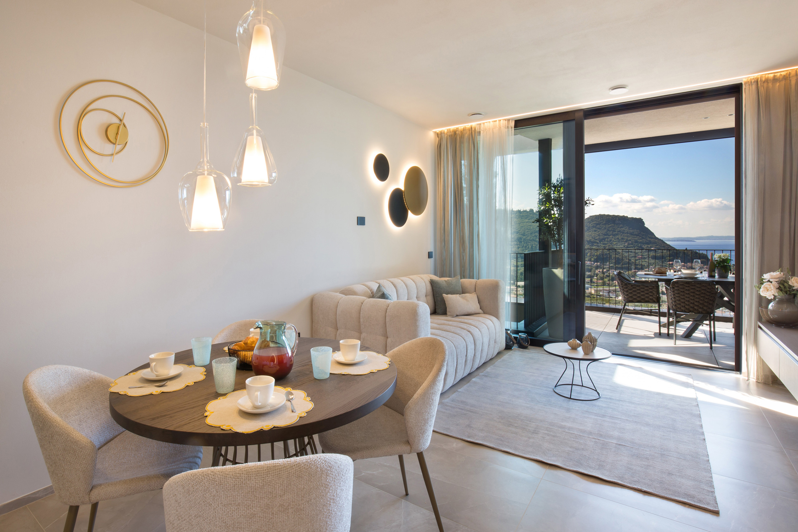 The living area is newly and elegantly furnished and features a dining table for four people, a sofa and a satellite television. Outdoors on the lake view terrace, there is a table with 4 armchairs for outdoor meals.