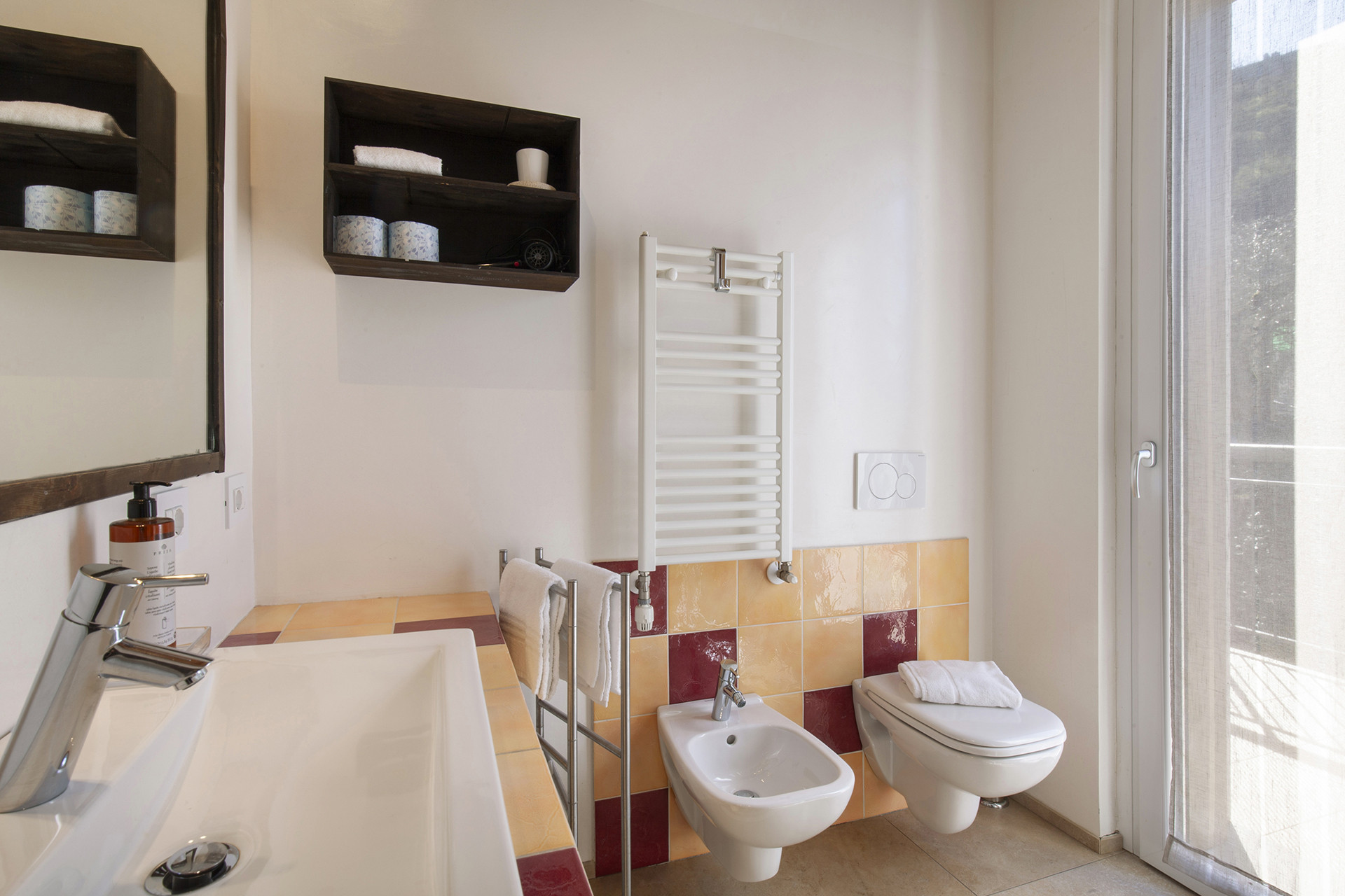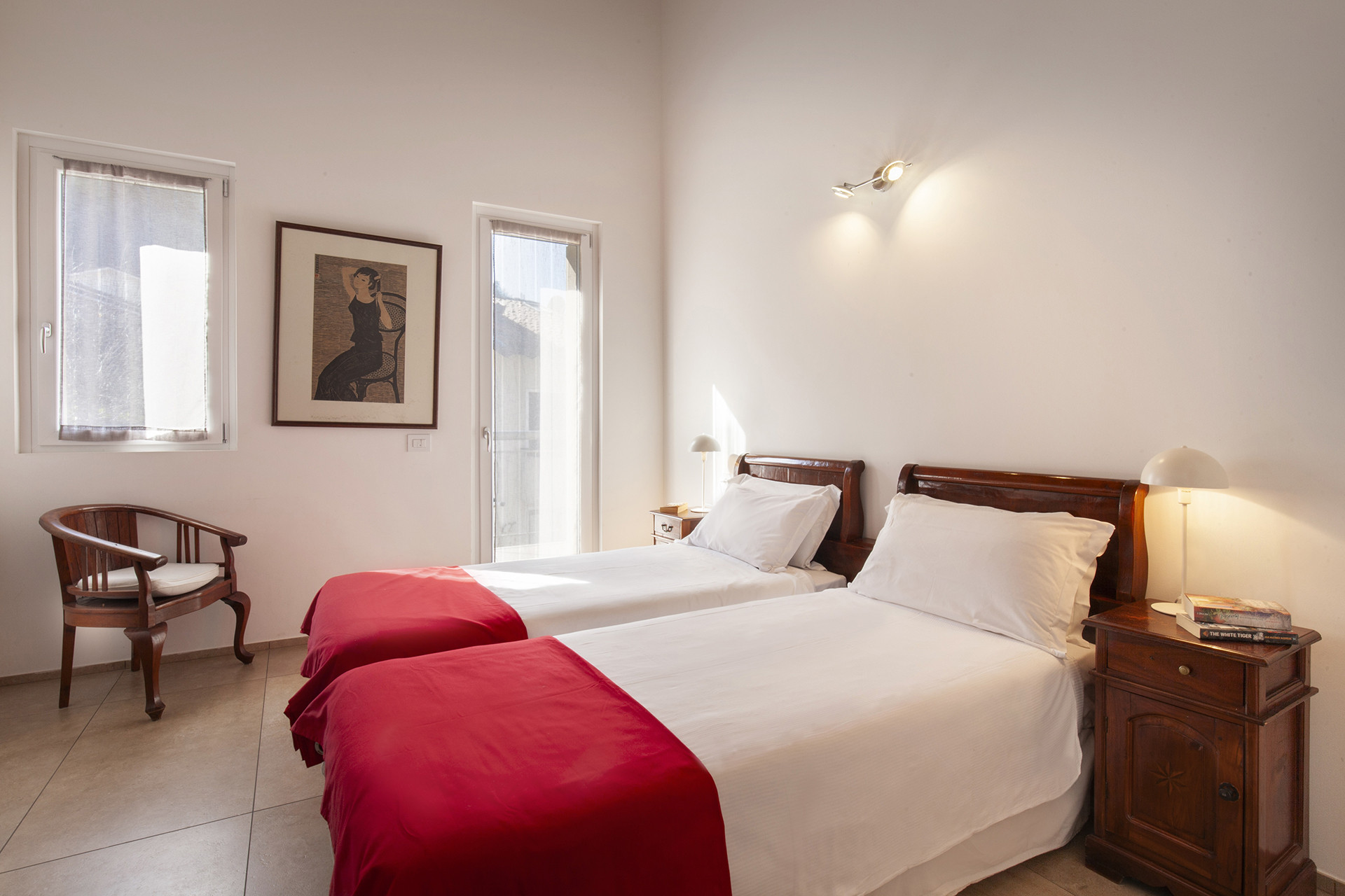 The other bedroom consists of two single beds, an antique wardrobe with a mirror, two bedside tables and an armchair and also has a bathroom with a shower. The second large terrace is accessible from this room and from the external relaxation areafrom the sunbeds you can enjoy the view of the beach and the lake.