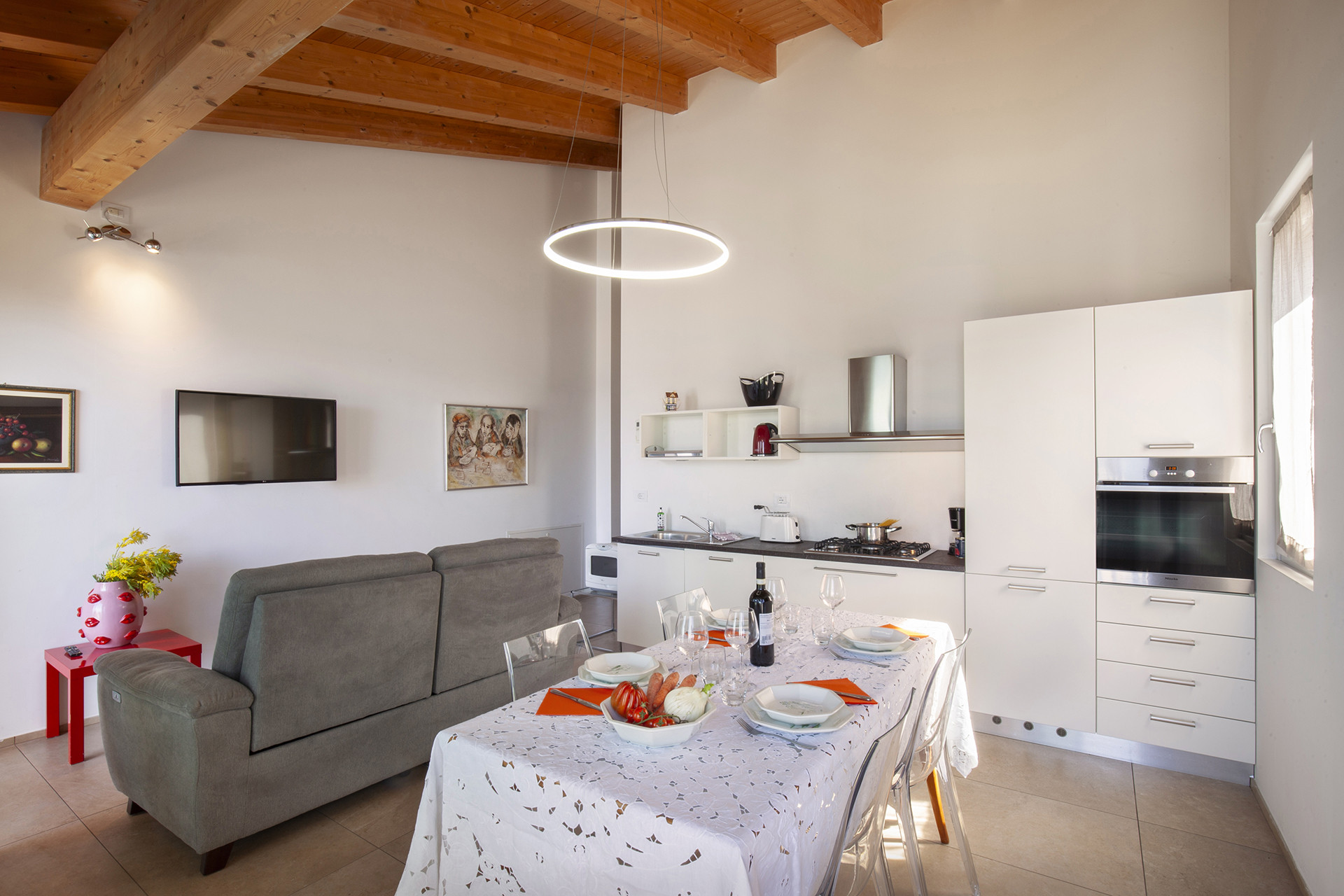 A large dining table completes the dining area and a sofa allows you to comfortably watch the flat-screen satellite TV.