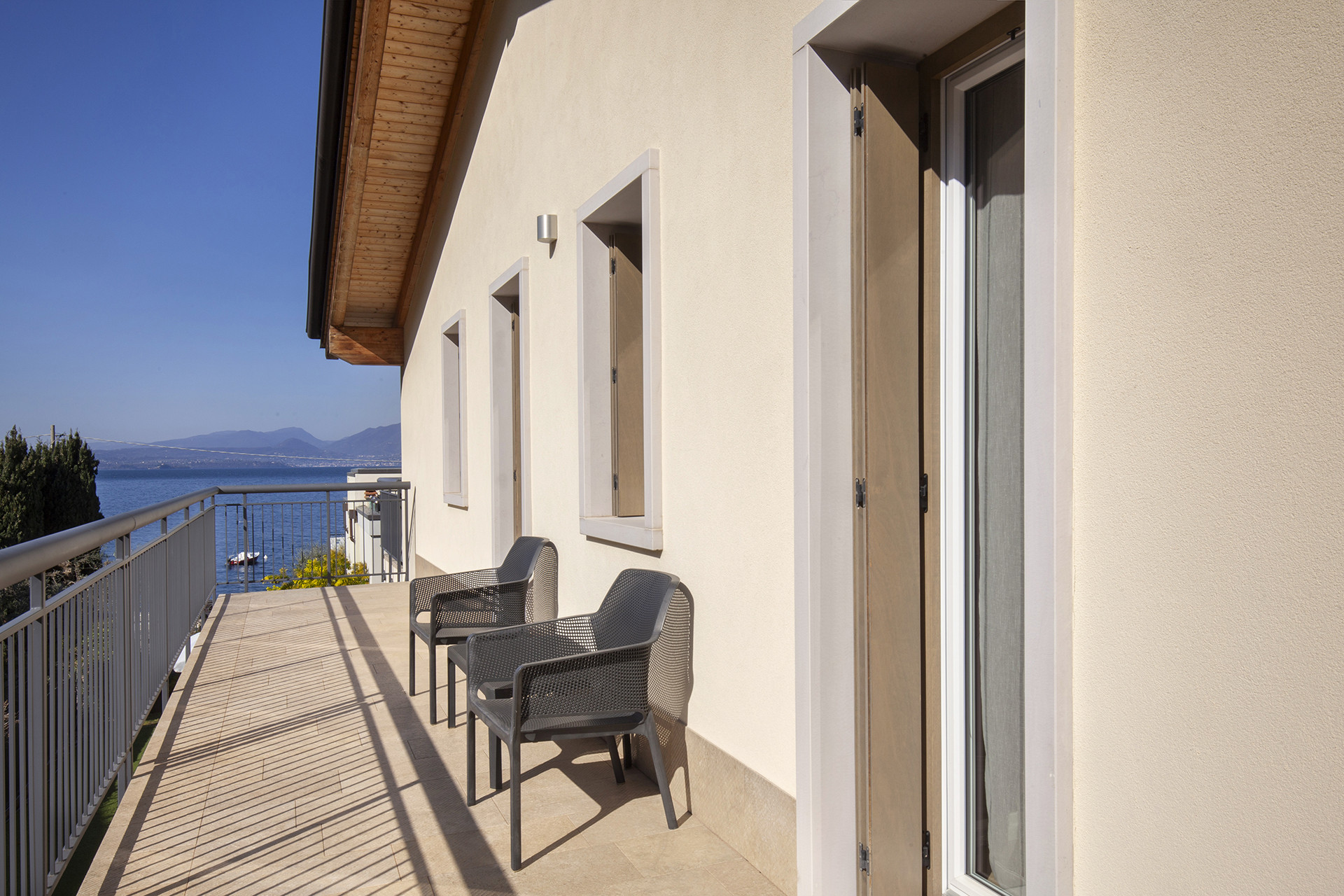 Upon entering the apartment, you will find the living room overlooking the large balcony with a table to enjoy the splendid view of Lake Garda.
