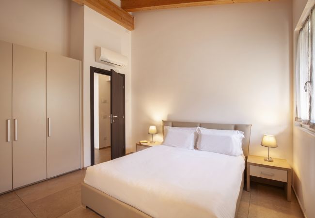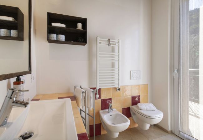 The ancient marble staircase rises from the living room, leading to the air-conditioned Double Room with a large wardrobe. A small terrace overlooking the lake completes this floor.