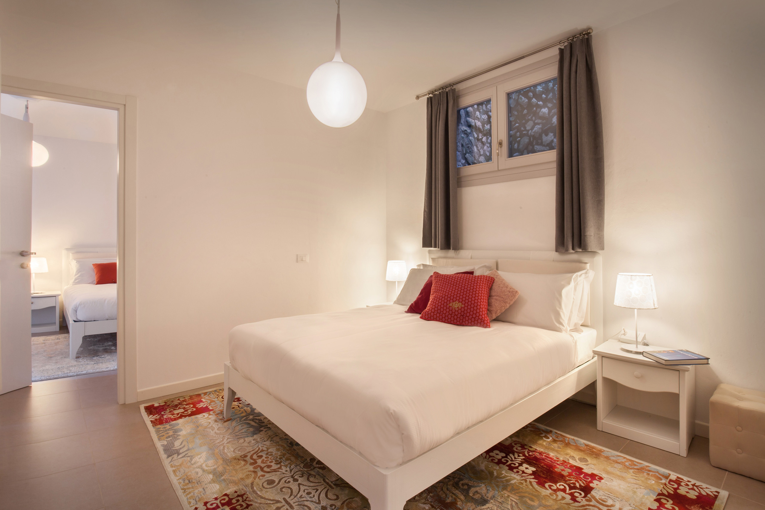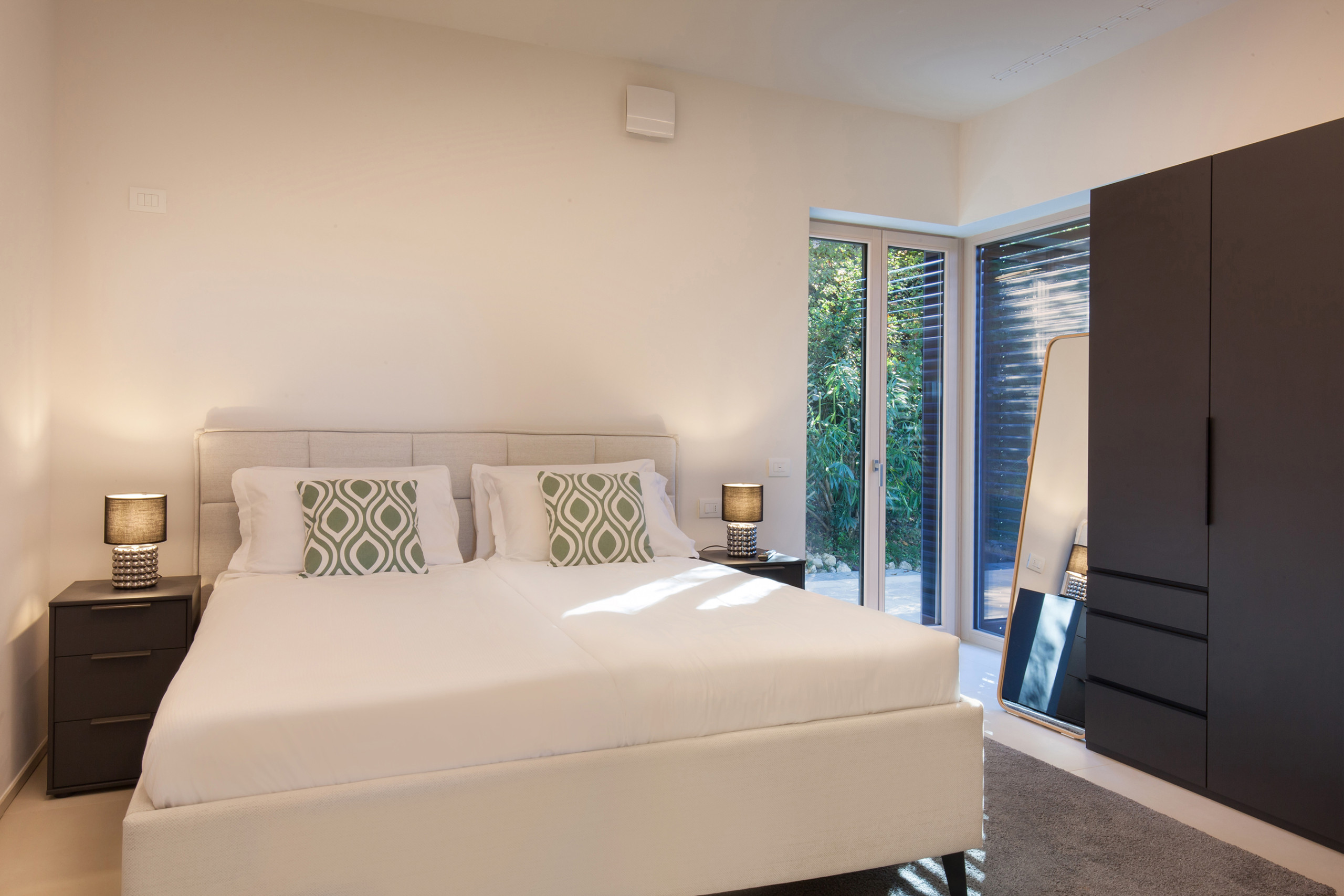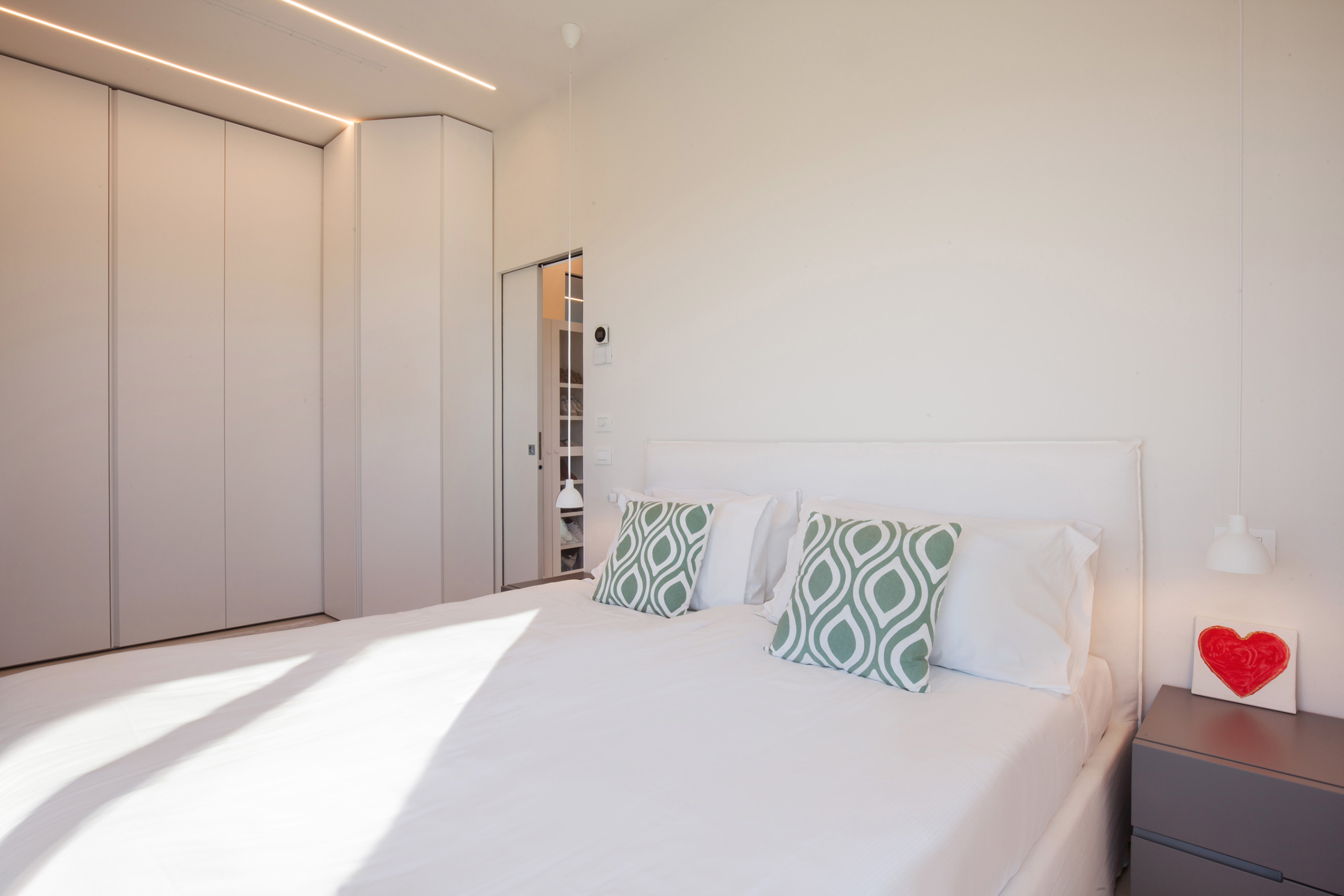 The sleeping area includes a double bedroom with a door-window overlooking the external terrace, a large walk-in wardrobe and a second double bedroom.