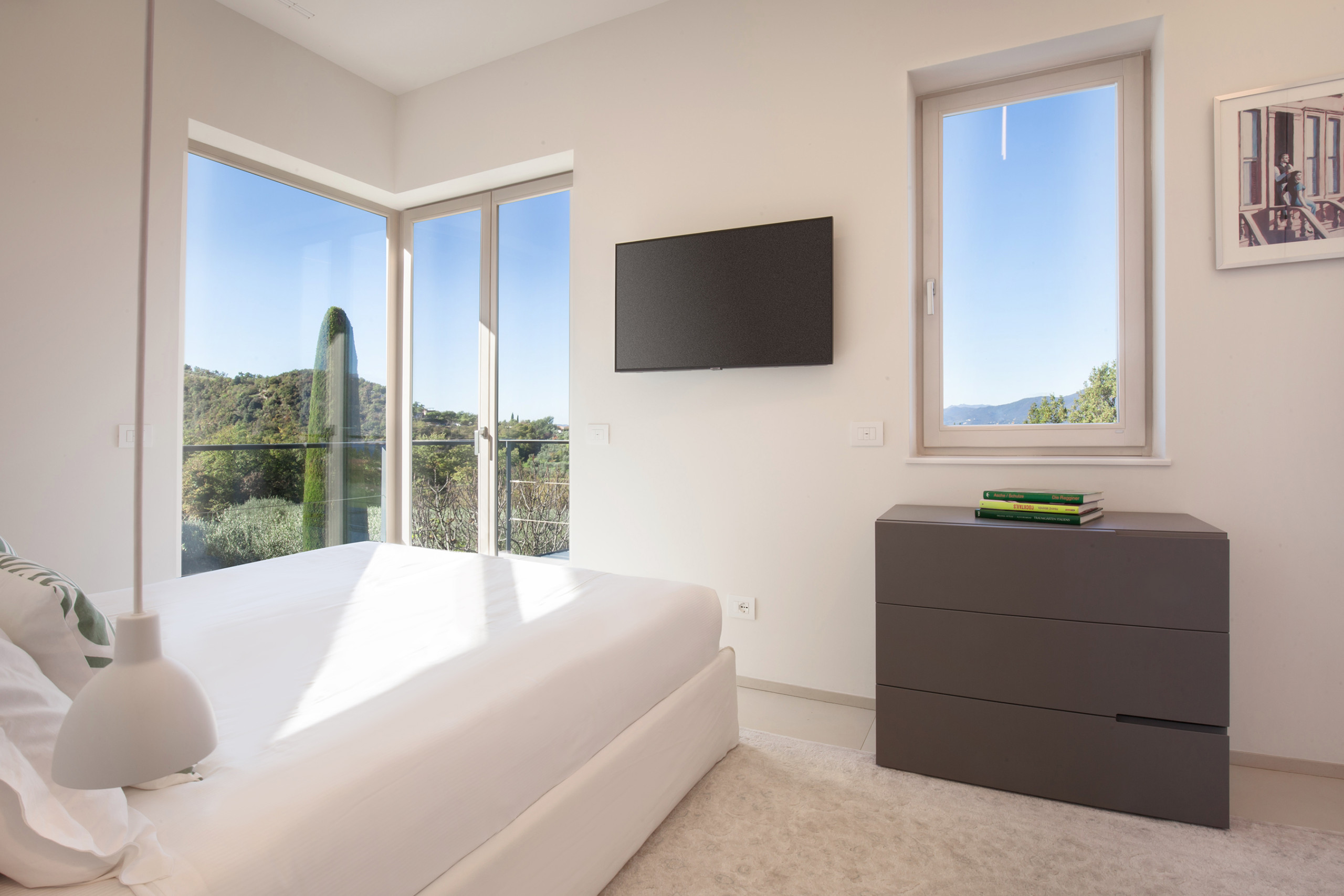 On this floor, there are 3 bedrooms with double beds and one with two single beds. Two bedrooms overlook the lake and two overlook the garden at the back of the villa. On this floor, there is a full bathroom with a large shower. A second bathroom with a large bathtub is located on the external staircase of the house between the first and ground floors.