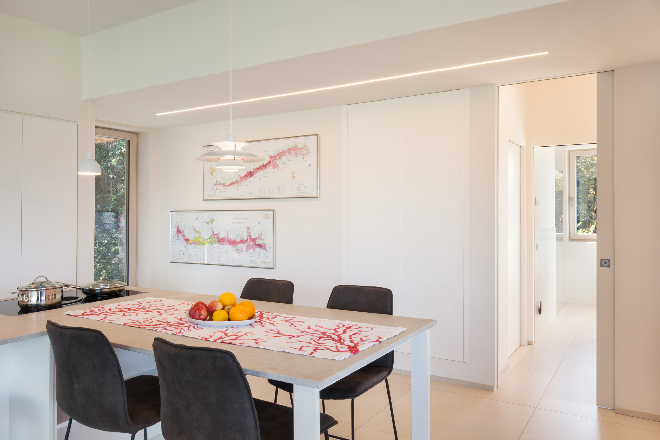 You could eat all together around the modern meal table for 10 people adjacent to the kitchen and protected by glass doors that face the outdoor terrace.