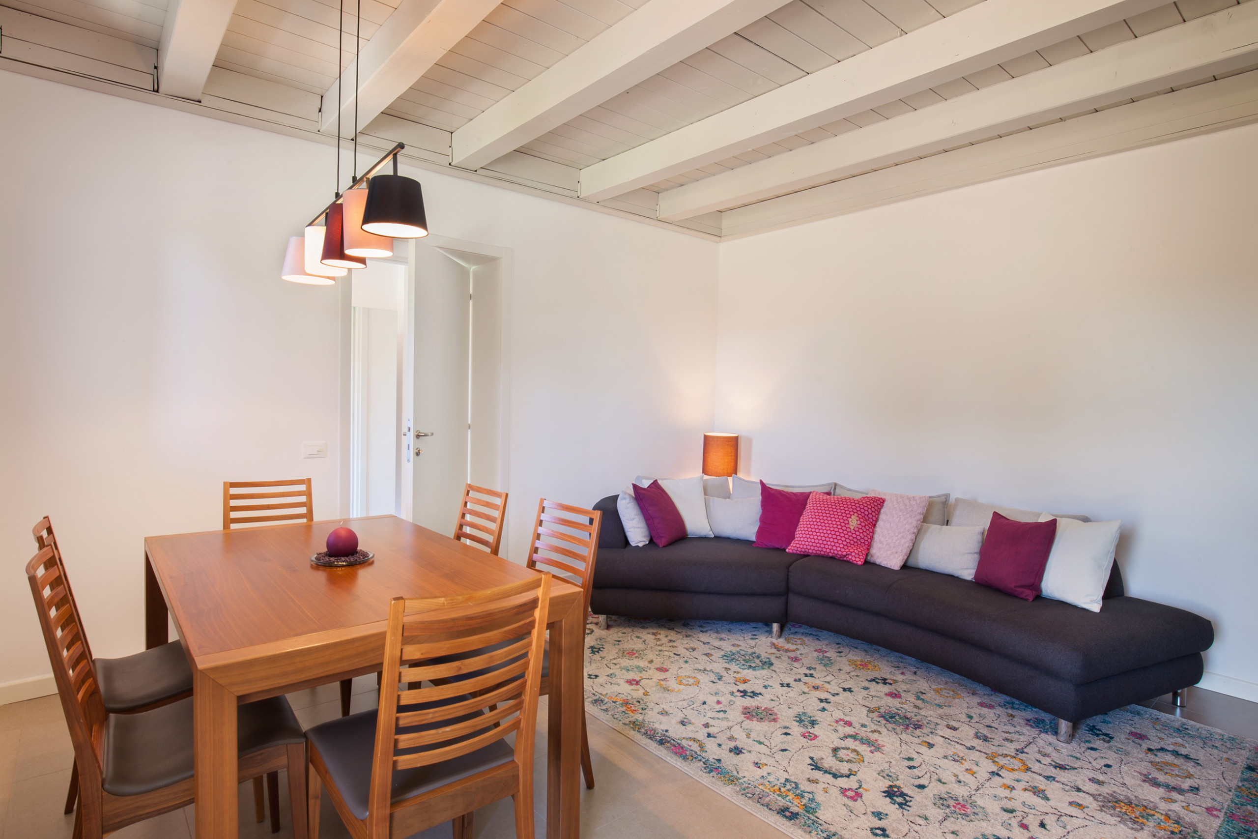 Entering on the right, the living room opens up, furnished with a comfortable sofa, a dining table for 6 people and a TV: a perfect space to relax or watch a film.