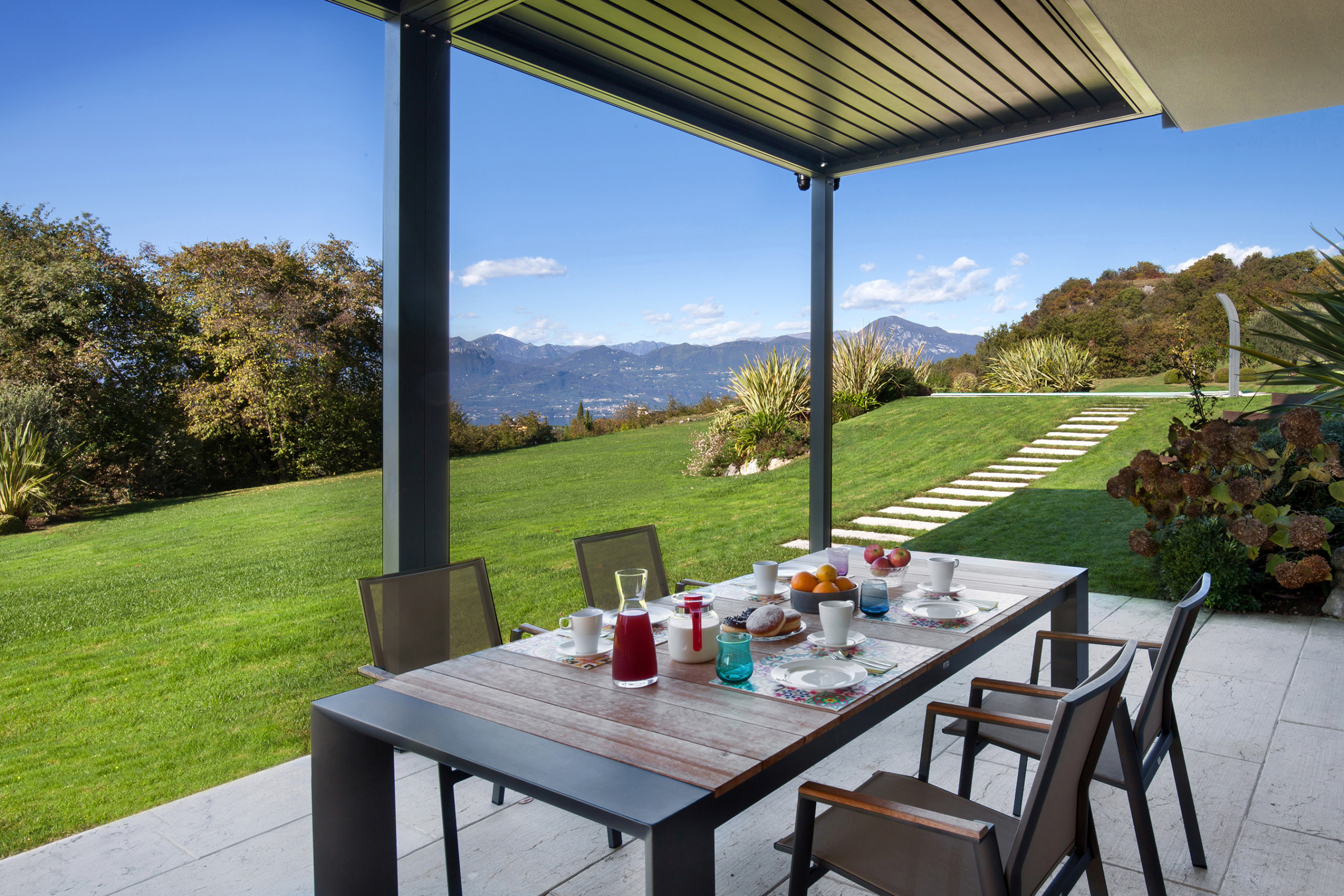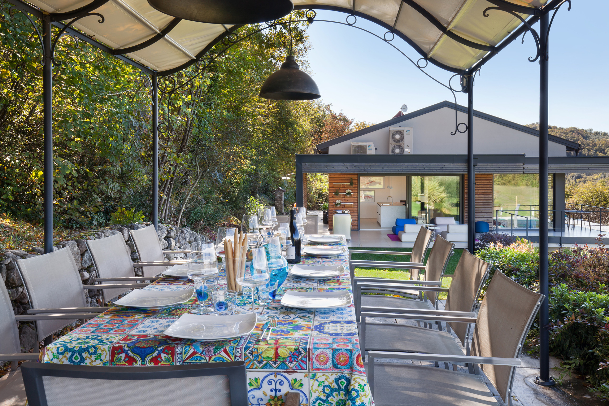 Adjacent to the terrace is a large outdoor dining table for 10 people, covered by an elegant gazebo: the ideal space to gather the whole family or group of friends for outdoor lunches and dinners.