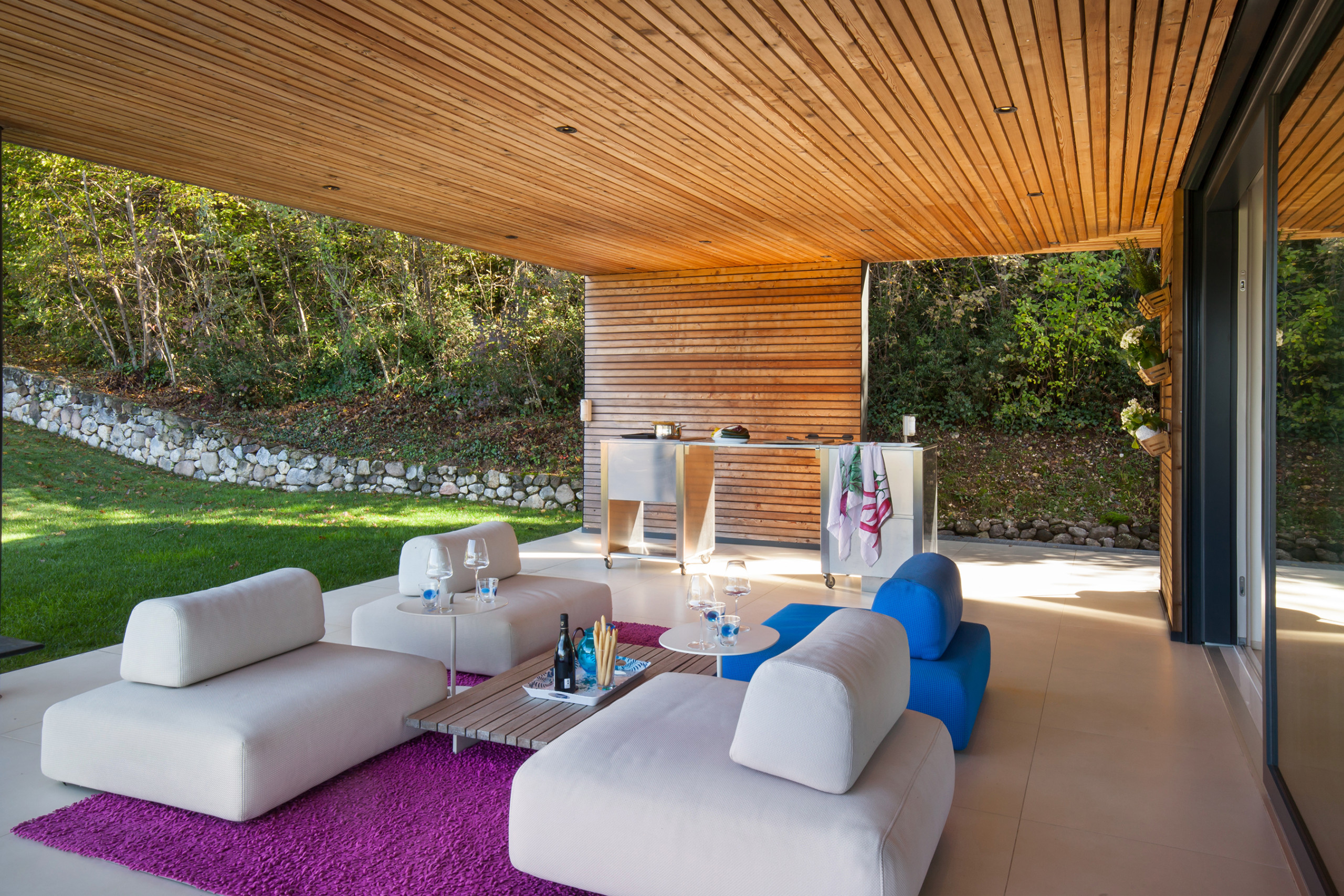 Outside, guests have a covered terrace furnished with a lounge, ideal for enjoying an aperitif at sunset with a lake view.