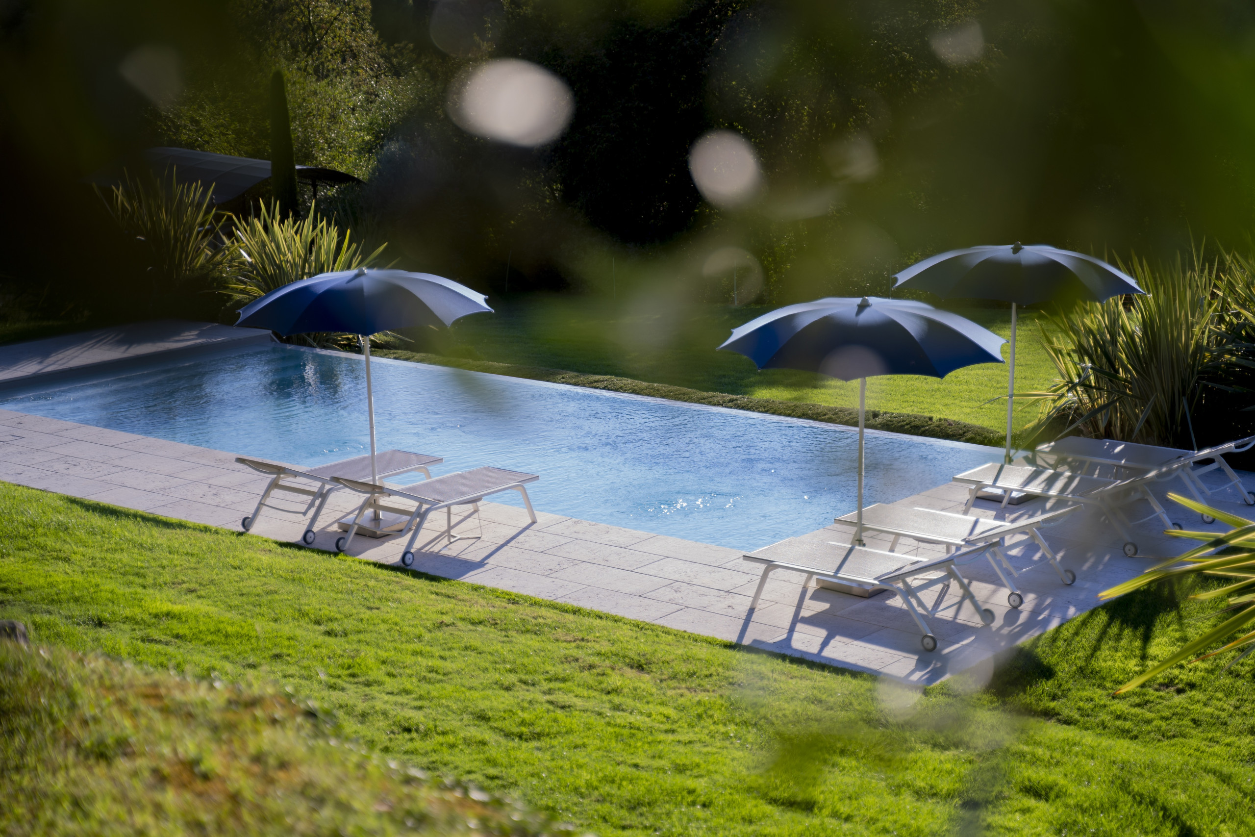 The private swimming pool, spacious and sunny, is surrounded by a dedicated area with sun loungers and parasols.