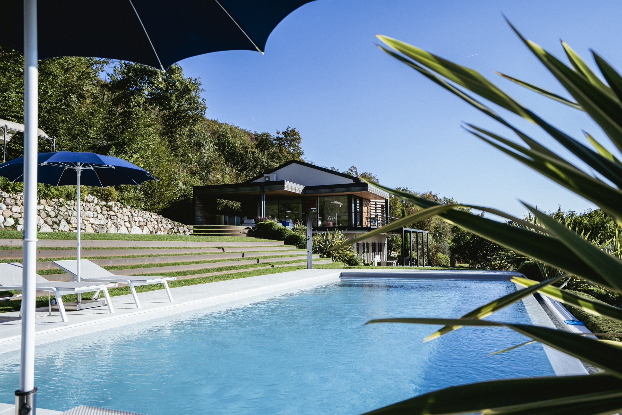 On the terrace with a great view of the lake, there is the dining table and the BBQ, and the small pool with a wide view of the lake and a sunbathing area. The property has a garden with terraces where you can relax or sunbathe.